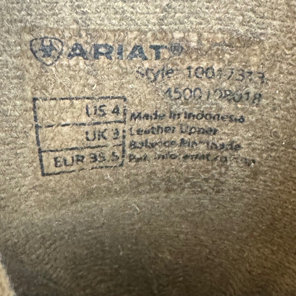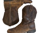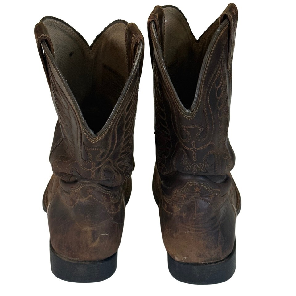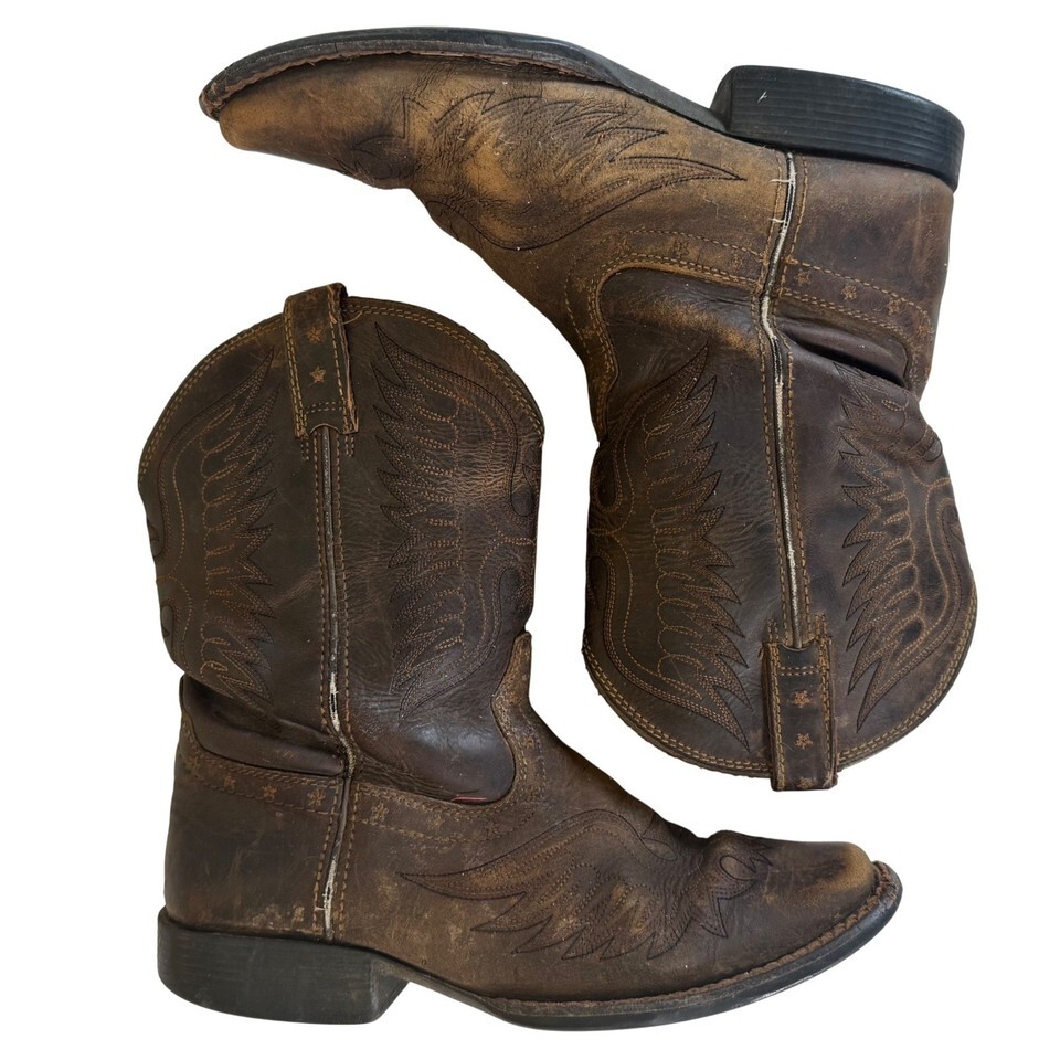 Classic Ariat western boots in rugged brown leather, style 10017537. Short-shaft design with pull tabs, star details, and stitched flame-wing pattern. Well worn with heavy cosmetic wear, creasing, and scuffing throughout, but fully intact and solid?no holes or sole separation. Great for work, ranch wear, or distressed western style.