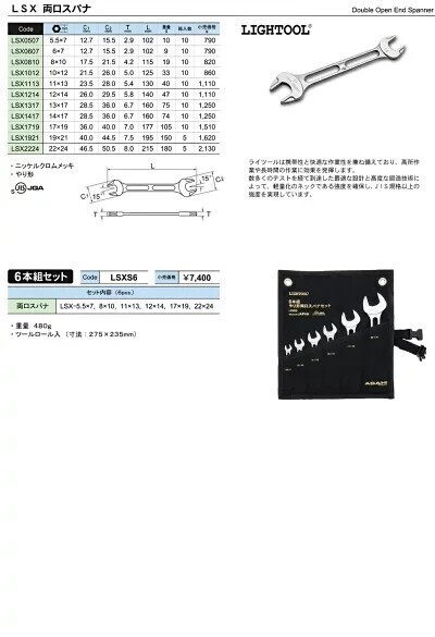 - Asahi LSXS6 LIGHTOOL 6-pc Double open end wrench set 5.5x7mm-22x24mm USA stock