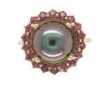 14k white gold ring featuring a 9.5mm black cultured Tahitian pearl with pinkish-purple sapphire halo. The pearl is a fine quality with peacock and aubergine overtones. It is very clean without blemishes. There are eighteen small round brilliant cut 2mm raspberry sapphires weighing 1.42 carats total.