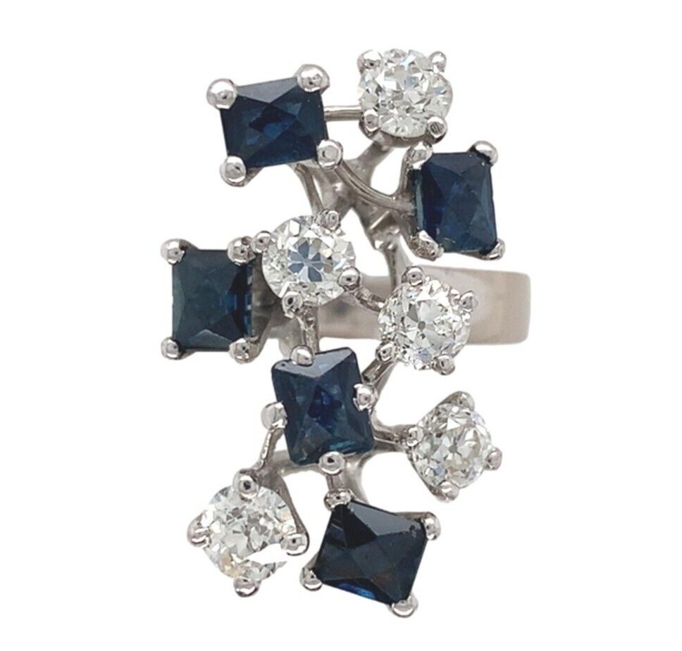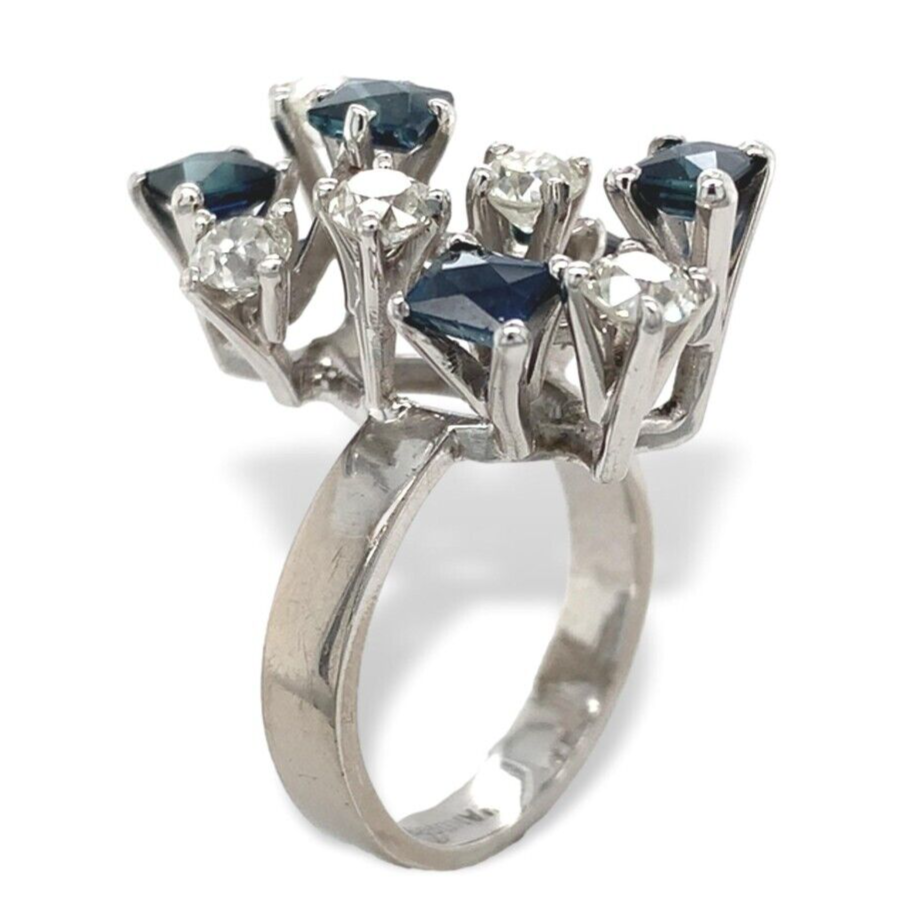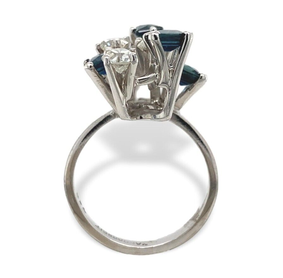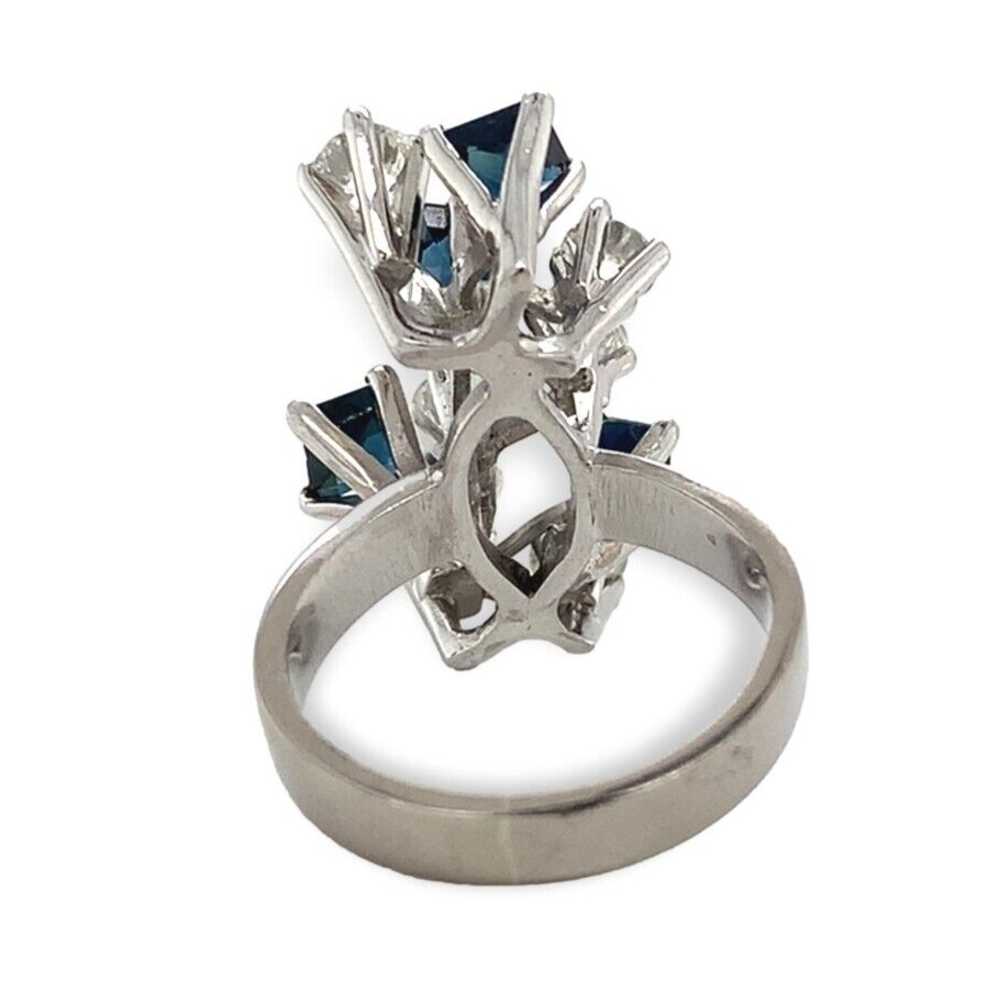 Handmade 18k white gold blue sapphire and diamond modernist ring. There are five genuine French cut rectangular blue sapphires of various sizes. The largest measures about 4.7mm x 3.5mm. There are five round European cut diamonds measuring about 3.9mm each and weighing about .25cts each. The sapphires have wear and one is chipped. One of the diamonds has a chip.