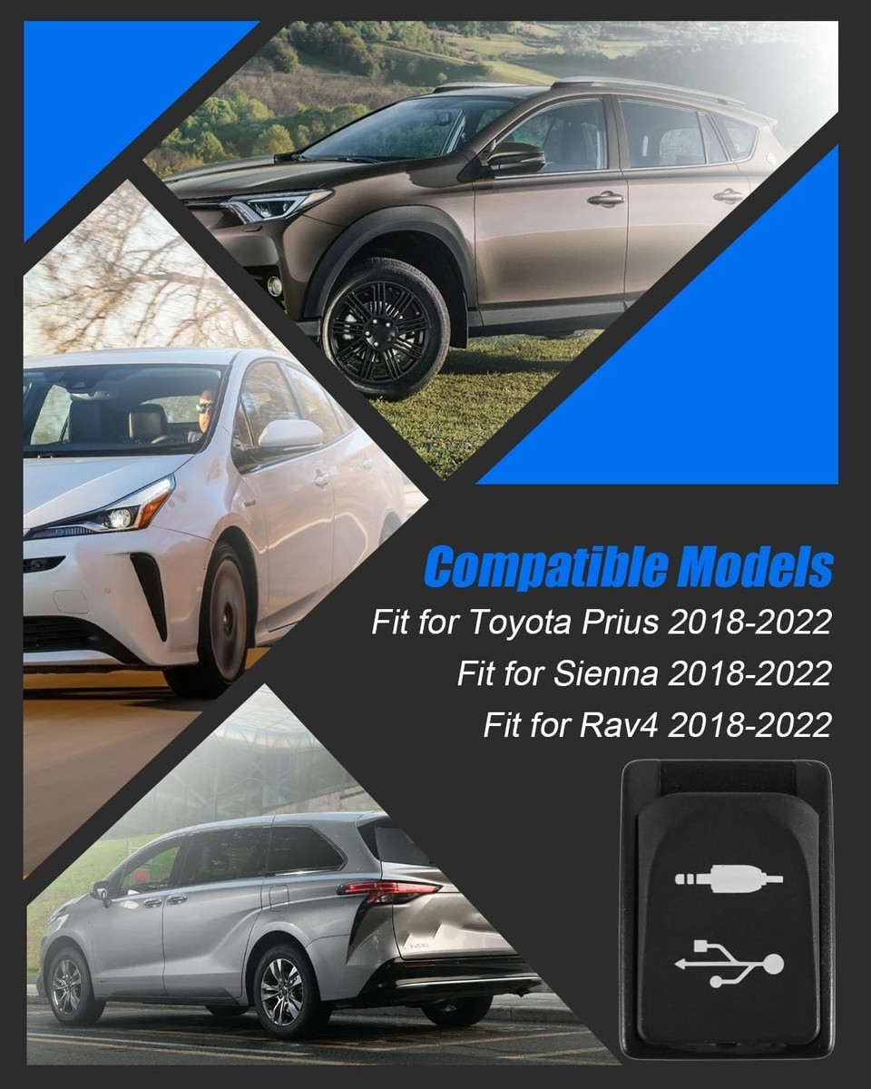 Compatible Models: Auxiliary USB Port Fit for Toyota Hiace Majesta 2019 Fit for Toyota Prius 2015 Fit for Toyota Prius Prime PHV 2016 Fit for Toyota RAV4 2018 Fit for Toyota RAV4 2018 Fit for Toyota Sienna 2010?2020 Replace 86190-12040