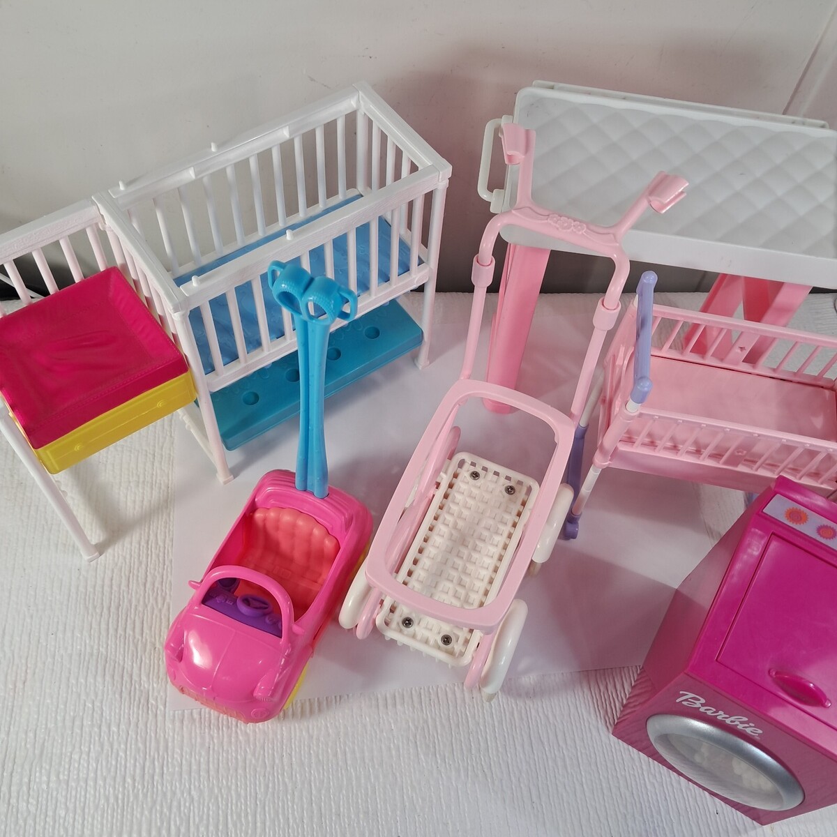 Barbie baby set Midge strollers crib Changing Table washing machine Skipper Includes parts shown ONLY. Washing machine works. Minor play wear from use. See pics. Includes: Happy Family Crib Skipper Babysitter Nursery Crib Washing Machine 2000 Babysitter Skipper Car Krissy Stroller Love 'n Care Baby Center Changing Table