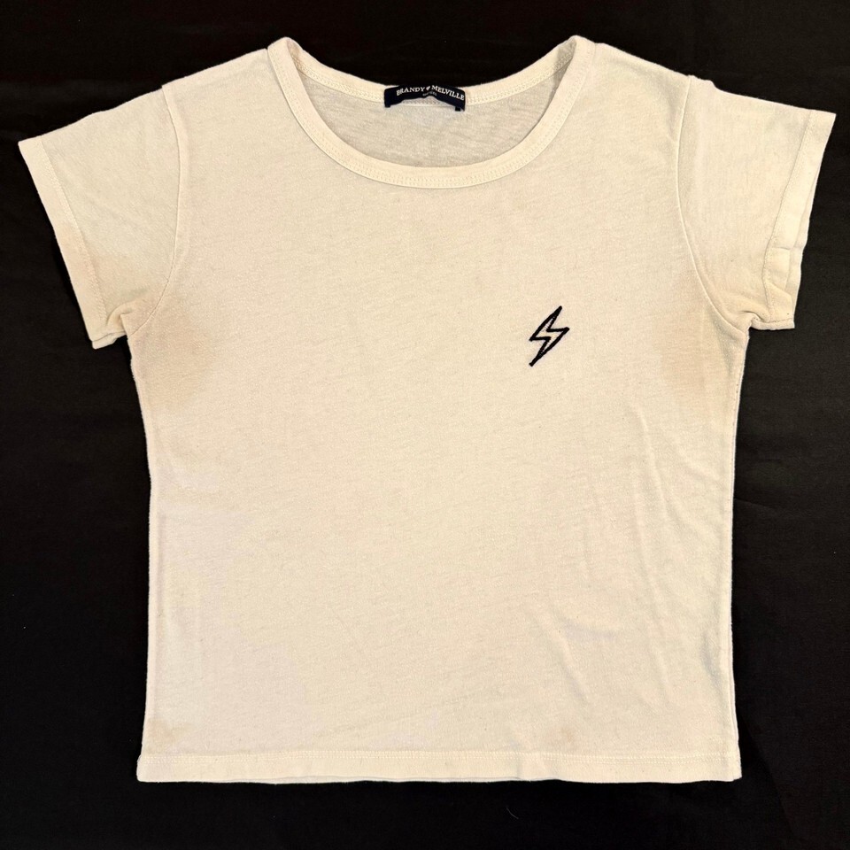 Brandy Melville embroidered lightning bolt tee. Soft cotton blend, made in Italy. One Size (fits XS/S, slim cropped fit). Cream color. Pre-loved: pits show some darkening (see photos). Measurements Flat (approx.): Pit to pit: 16" Waist: 15.5" Length: 19.5" Material: 60% Cotton / 30% Polyester / 10% Viscose Condition: Good, with noted wear.