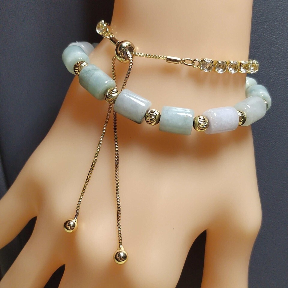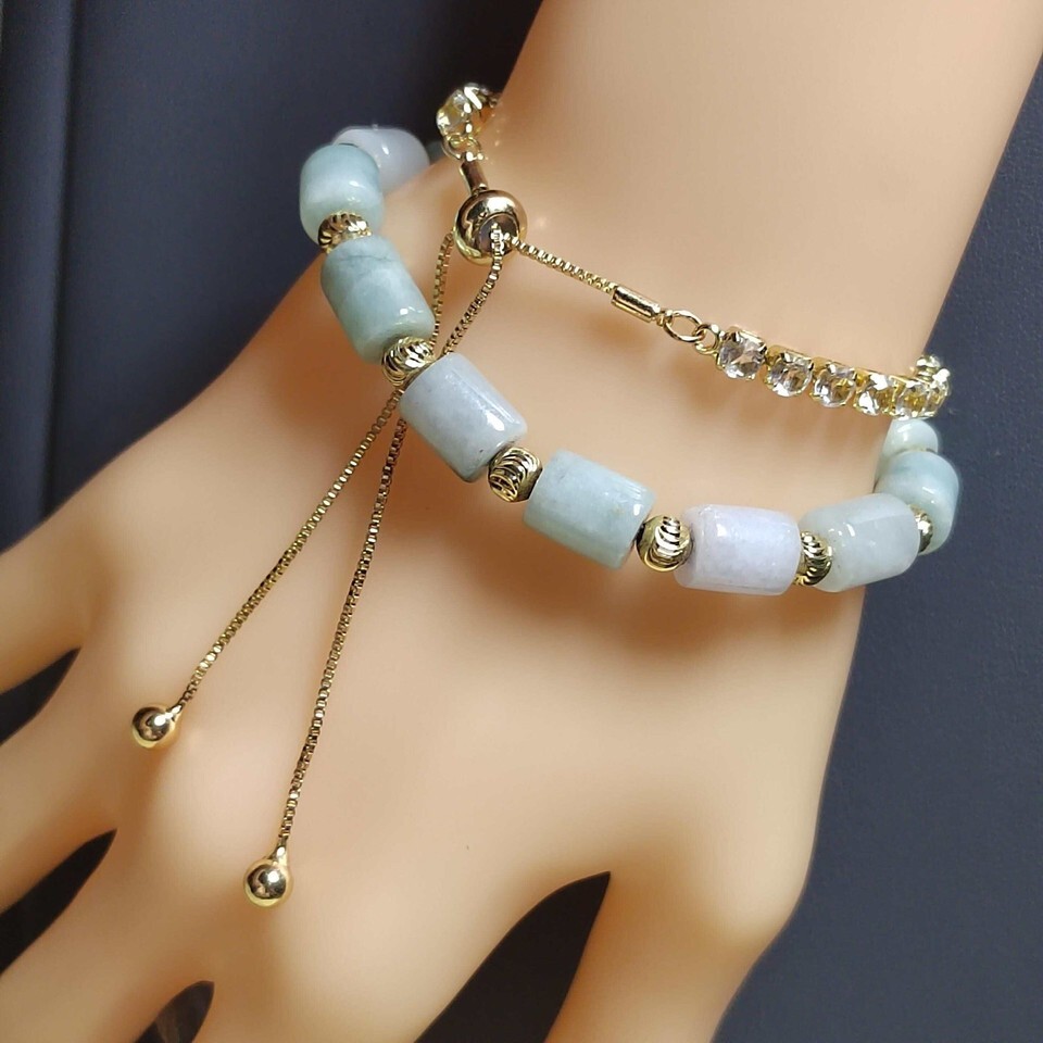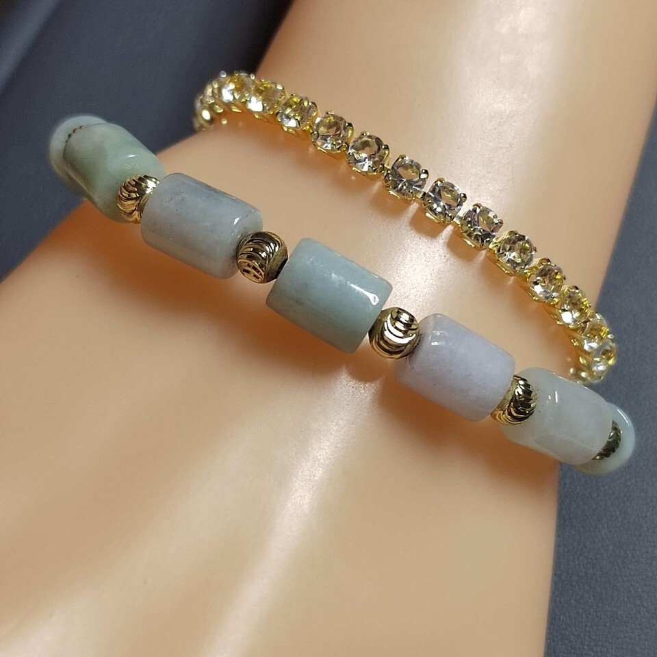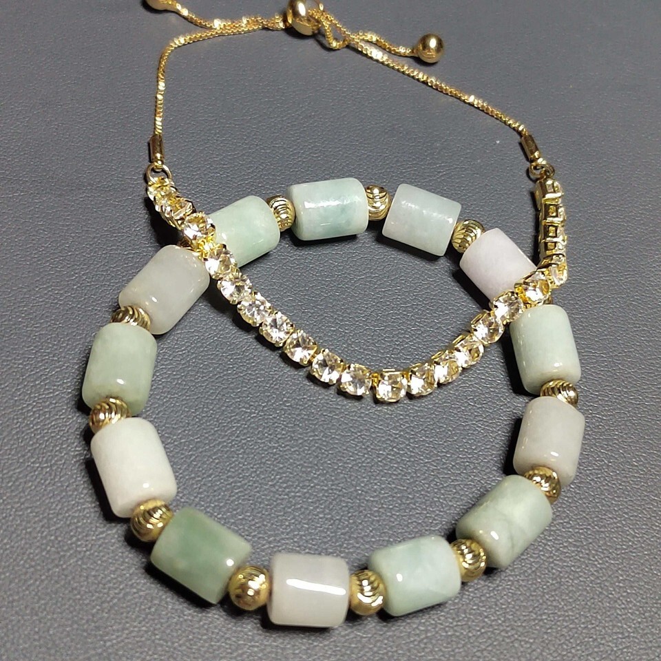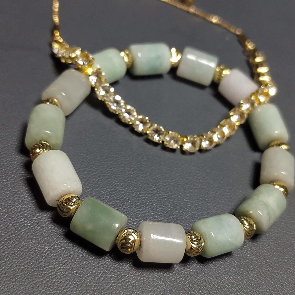 Add timeless elegance to your jewelry collection with this exquisite double-layer bracelet set, featuring a genuine Burmese jadeite bracelet paired with a sparkling rhinestone bracelet. The jadeite beads are cylindrically shaped and polished to perfection, showcasing soft green gradients that evoke serenity and natural beauty. Golden metal spacers enhance the jadeite’s tone, while the rhinestone bracelet adds a touch of glamour and contrast.