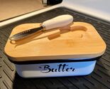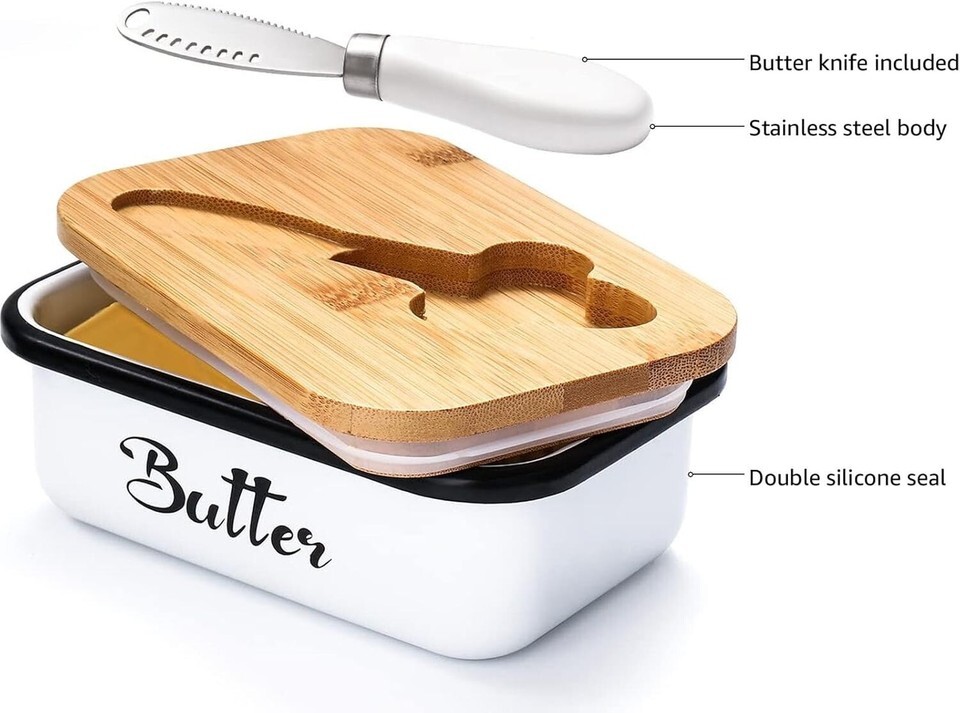 About this item Butter Dish with Lid and Knife: The butter dish with lid for countertop has been updated, so when you want to use the butter dish, you don't have to look for the knife anymore, and the butter dish with lid comes with a multi-purpose butter knife, the lid of butter dish fits perfectly with the butter knife, and the butter dish with knife has a smear, scraping, slicing three functions, when you cut and spread butter, the cover of the butter dish can be a cutting board. Durable Butter Dish with Lid for Countertop: This butter dish with lid for countertop made of metal material that more durable and much lighter than ceramic, which can effectively prevent slipping from your hands. The butter dish with lid size is 3.5*5.5*2in, this butter dish is wide and deep enough to hold various of butter. Butter Dish with Lid Sealing Upgrade: The cover of the butter container has a double-layer silicone ring, which greatly improves the sealing performance for butter dish with lid. In addition, the silicone sealing ring of our butter dish with lid for countertop is not easy to age, and the sealing effect is longer. Butter Dish Easy to Clean: Ceramic butter dish with lid can be cleaned with hot water and soap easily. And the lid of butter dish only needs to be rinsed with water or wipe with a damp cloth. Butter Dish with Lid for Gifts: The butter dish has a elegant kraft paper box, this butter dish with lid for countertop is an excellent choice for gifts to relatives and friends. If you encounter any problems while receiving the butter dish or using it, we will solve them immediately.