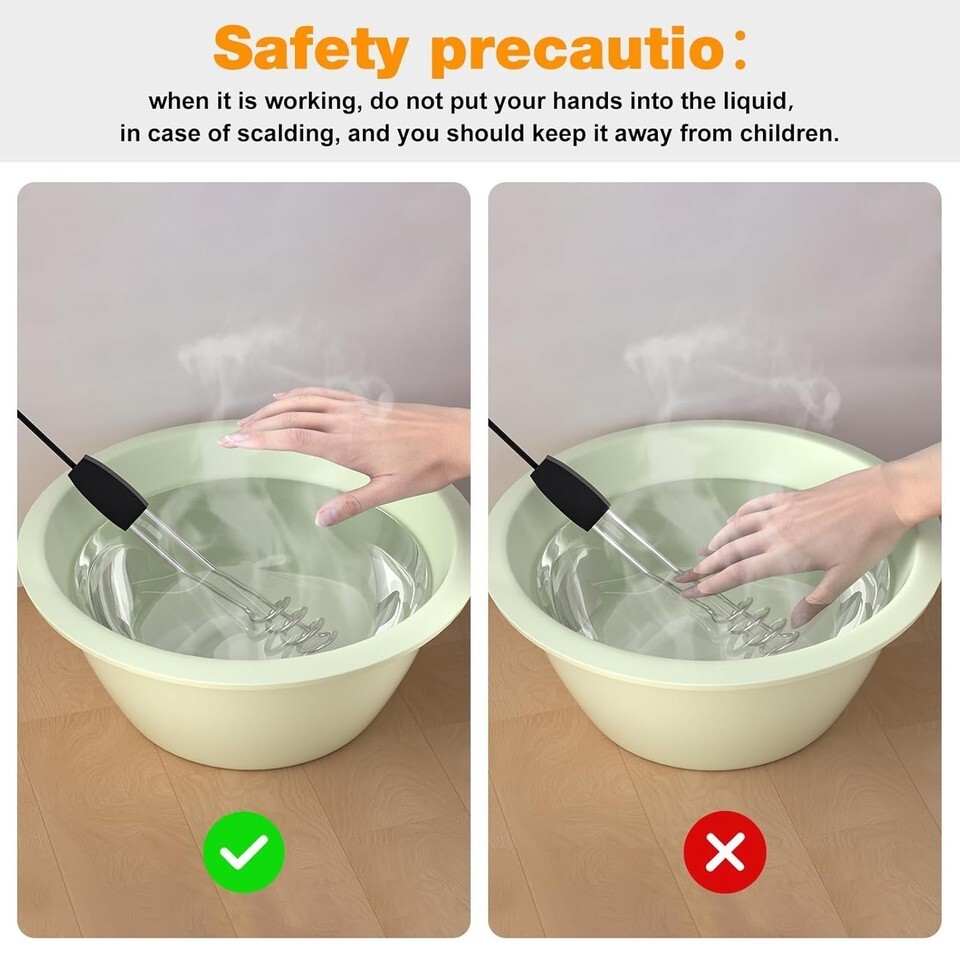 When the portable water heater is inserted into the wall socket, do not put your hands into the liquid. when it is working, you can't touch it, in case of scalding, and you should keep it away from children. Before removing the heating element, cut off the power supply. Designed for convenience, this immersion water heater is incredibly easy to use.
