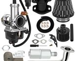 Package Includes: 1 * PZ30 carburetor, 1 * exhaust header pipe, 1 * muffler, 1 * 42mm air filter, 1 * intake manifold, 1 * 12mm air filter, 1 * fuel filter, 3 * gaskets, 1 * fuel line, 6 * clamps, 3 * wrenches, 6 * screws, 4 * ties, 1 * heat shield tape