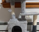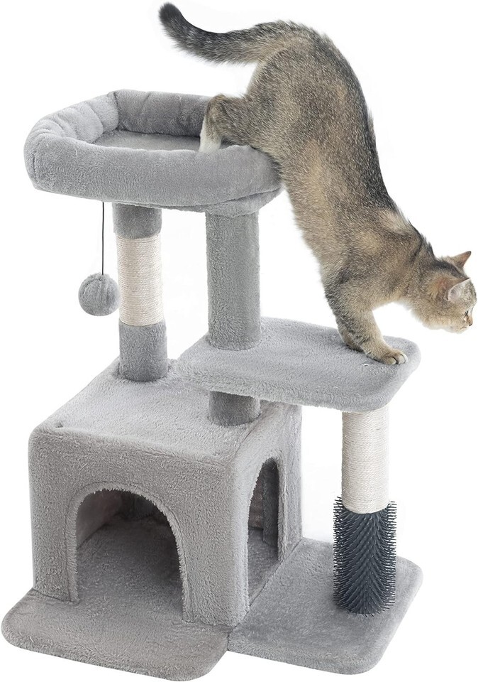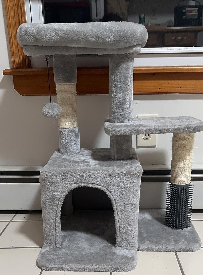 About this item MULTI_FUNCTION: This 29 Inches multi-level cat tree is perfect for your kitty to bounce up and down. Spacious top perch and cozy private condo provide enough spaces for your kittens to take a break or be in a daze for a little bit. It?s also equipped with a massage post, your kitty can easily groom and scratch himself. DURABILITY: Thanks to its strong structure, this cat tree, which consists of durable particleboard and sisal-wrapped posts, will create long-lasting joy for your cat to climb, scratch, and lounge MAKE YOUR CAT HAPPY: Spoil your cats with this cat activity center so they won't feel lonely when you?re away, and let them play and relax in comfort SIMPLE TO ASSEMBLE: All the required accessories and tools are included and you can assemble this cat tree quickly and use it with a clear manual. ATTENTION: It?s designed for kitty or small cats, not ideal for large cats, all the sizes are marked on the second image.