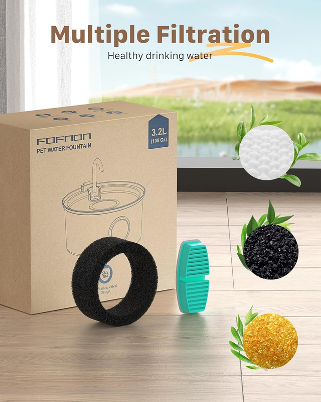 ?Advantage: Multiple Filtration? Dog water fountain uses multiple filtration systems. The carbon filter is made of various materials to effectively filter out dust, fine debris and soften the water. The pump filter attracts floating hairs in the water dispenser. Purifying water quality, pets can drink water without worry.