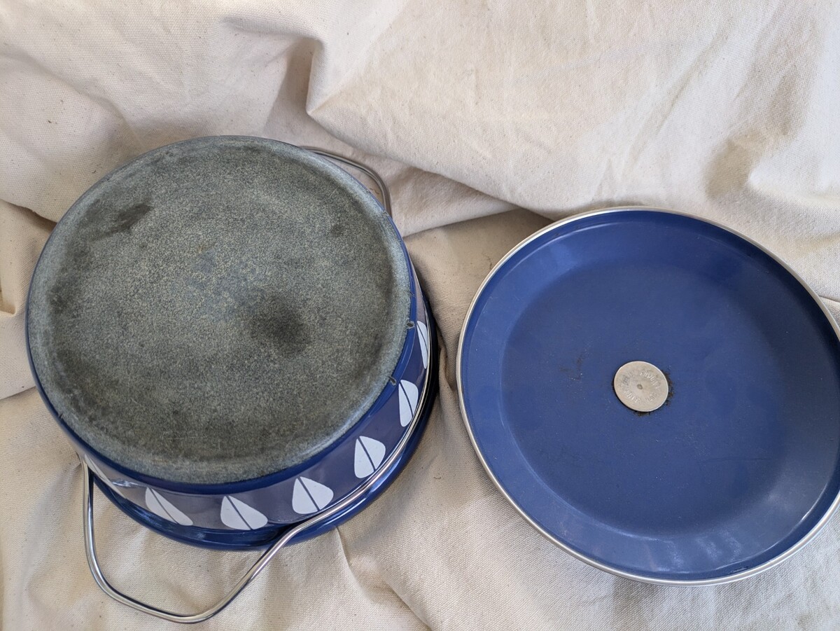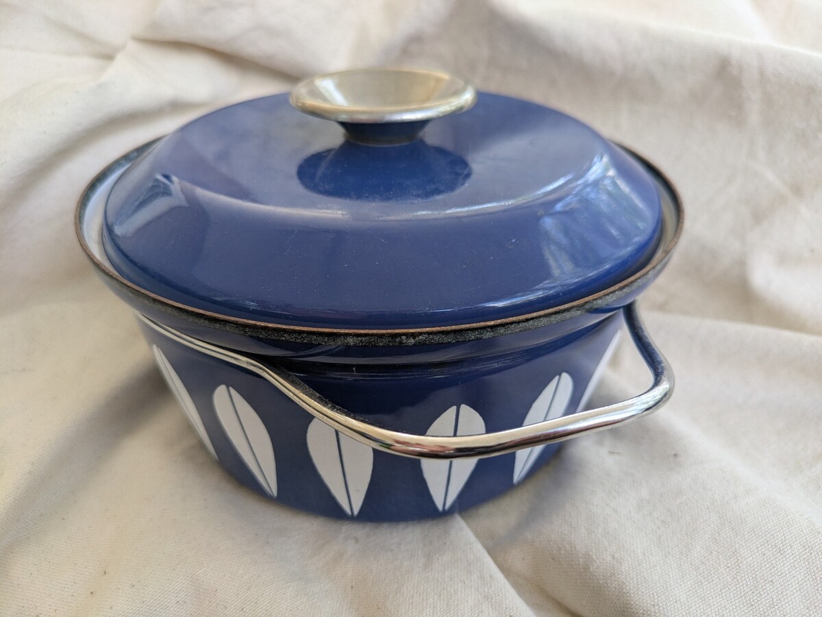 Fabriquee avec soin, cette cocotte pour four hollandais de 3 pintes Cathrine Holm allie fonctionnalite avec une touche de charme vintage. Dotee d'un bleu royal vibrant avec un motif de lotus blanc, cette piece est un ajout remarquable a toute collection de cuisine. Fabrique en Norvege entre 1960 et 1969, il reflete l'elegance intemporelle de l'epoque. La cocotte est compatible avec les cuisinieres electriques et a gaz et est livree avec un couvercle, doublant sa polyvalence. Sa surface emaillee durable facilite le nettoyage, tandis que la double poignee assure une manipulation sûre. Avec une longueur de 10 pouces, une largeur de 8 pouces et une profondeur de 4 pouces, c'est la taille parfaite pour une variete de besoins de cuisson et de service.