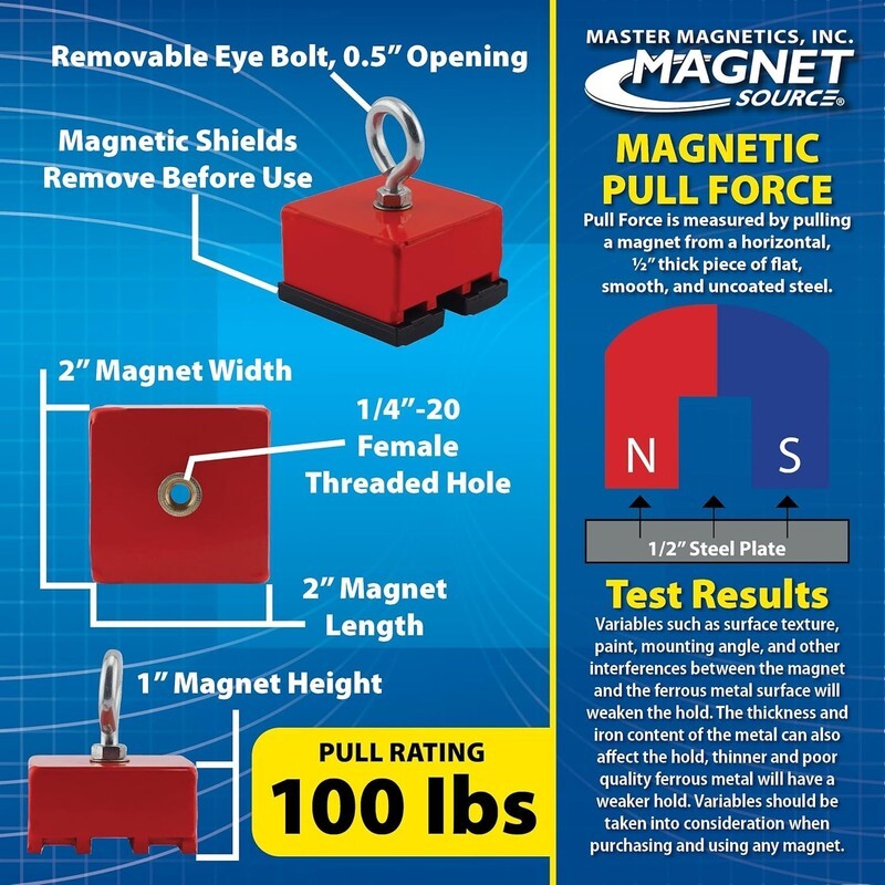 The Master Magnetics Fishing Magnet with Eyebolt is a powerful retrieving and holding magnet. This heavy-duty ceramic magnet holds [#] lbs when in direct contact with a 0.25" thick, flat, smooth ferrous steel plate in a vertical test. The force is 50% less on a vertical surface holding against sliding force, and is less on painted steel. It is ideal for retrieving hand tools and other metal items, holding and positioning spray nozzles, hanging banners, and more.