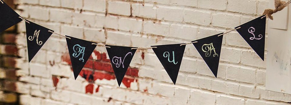 Make us an offer Pennant shaped chalk board garland. Leave your message on these hanging chalk boards. 7 flag shaped pennant boards Perfect for parties and holidays. 71 inches burlap hanging cord and 7 pennants with black chalk board on one side. Chalk not included Triangle Hanging Chalk Pennant Shaped Wooden Boards on a Cord 7 boards on the string Great for parties, Pennant shaped Burlap hanging cord Chalk not included