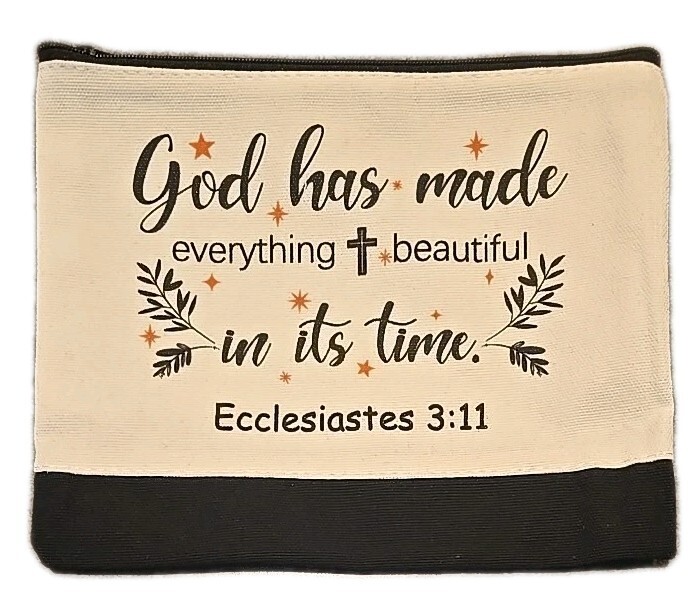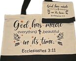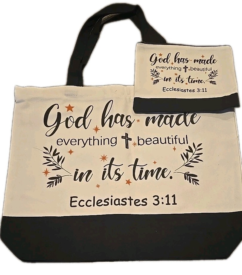 This Sale is for One (1) Tote Bag One (1) Matching Makeup Bag Scripture on both bags reads: God has made everything beautiful in its time. ~ Ecclesiastes 3:11 Canvas material Multicolored ~ Black ~ Cream ~ Gold Tote bag measures approximately 11.5" height x 18" width Strap drop measures approximately 9" Makeup bag measures approximately 6.5" height x 8.5" width Zipper closure Items are new ~ Never used Please view photos for a good description of these items Thank you!