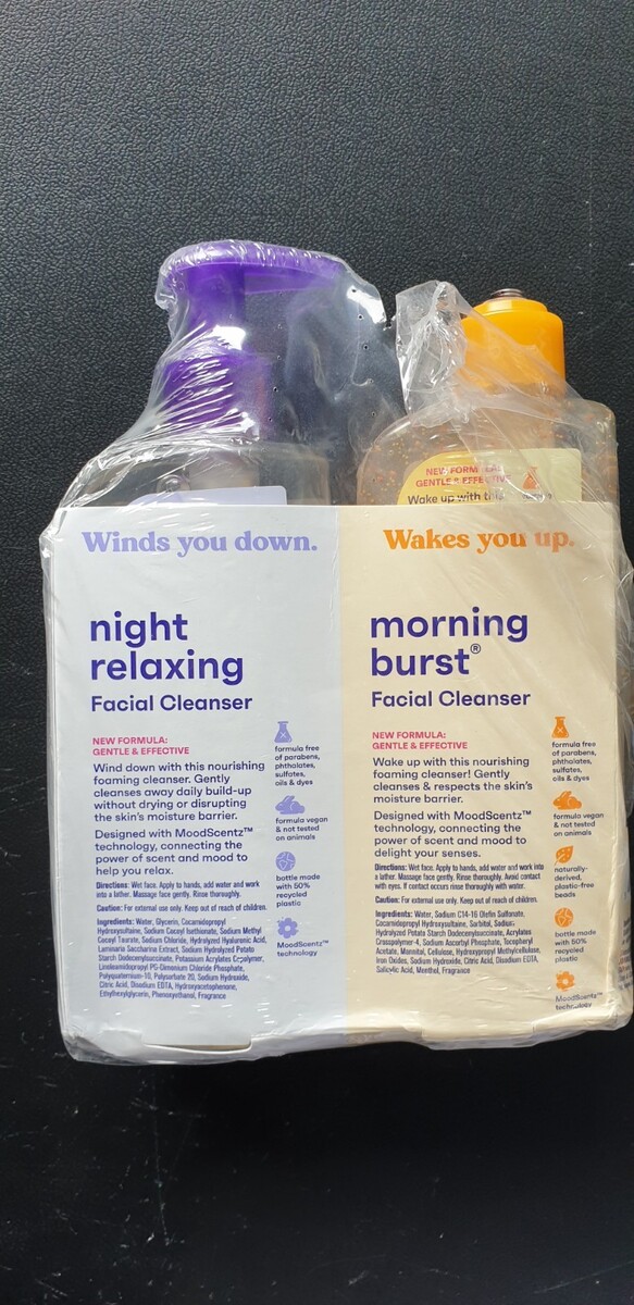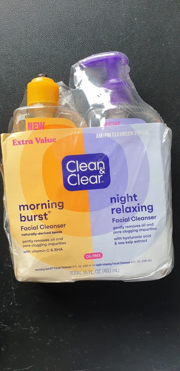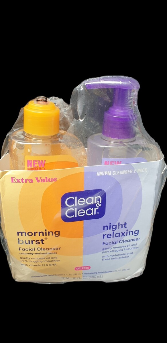 Clean Clear Morning Burst and Night Relaxing Facial Cleanser 16 Fl Oz 2-Pack Description Clean Clear Morning Burst and Night Relaxing Facial Cleanser 16 Fl Oz 2-Pack. Product Detail ? Brand: Clean Clear ? Formulation: Gel ? Volume: 16 Fl Oz ? Type: Facial Cleanser Please message me if you have any questions.