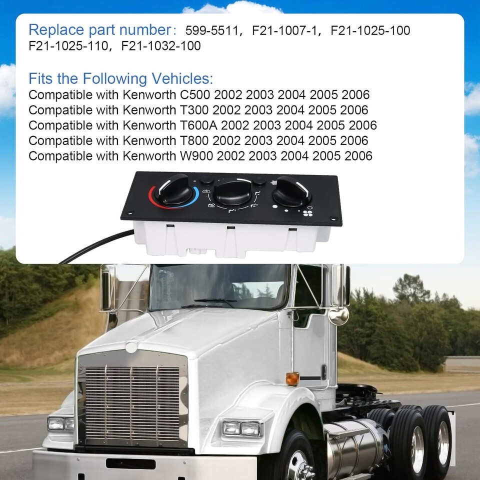 [FUNCTION] The Climate Control Module will restores the function of your heating, cooling and ventilation controls controls. [PERFECT REPLACEMENT] The Climate Control Module is identical in appearance and function to the factory module, retaining original look and feel, perfect replacement your original Climate module. [FITMENT] Climate Control Module compatible with 2002-2006 C500, compatible with 2002-2006 T300, compatible with 2002-2006 T600A, compatible with 2002-2006 T800, compatible with 2002-2006 W900. [REPLACE PART NUMBERS] 599-5511, F21-1007-1, F21-1025-100, F21-1025-110, F21-1032-100. [EASY INSTALLATION] Plug this climate module direct into your models and it will automatically configures the unit to the vehicle, no advanced vehicle knowledge is required.