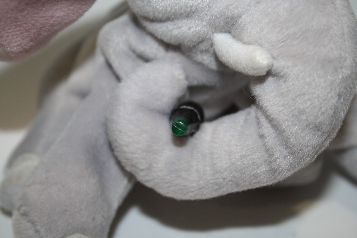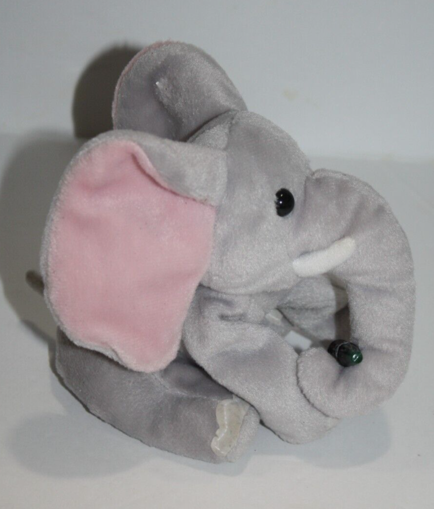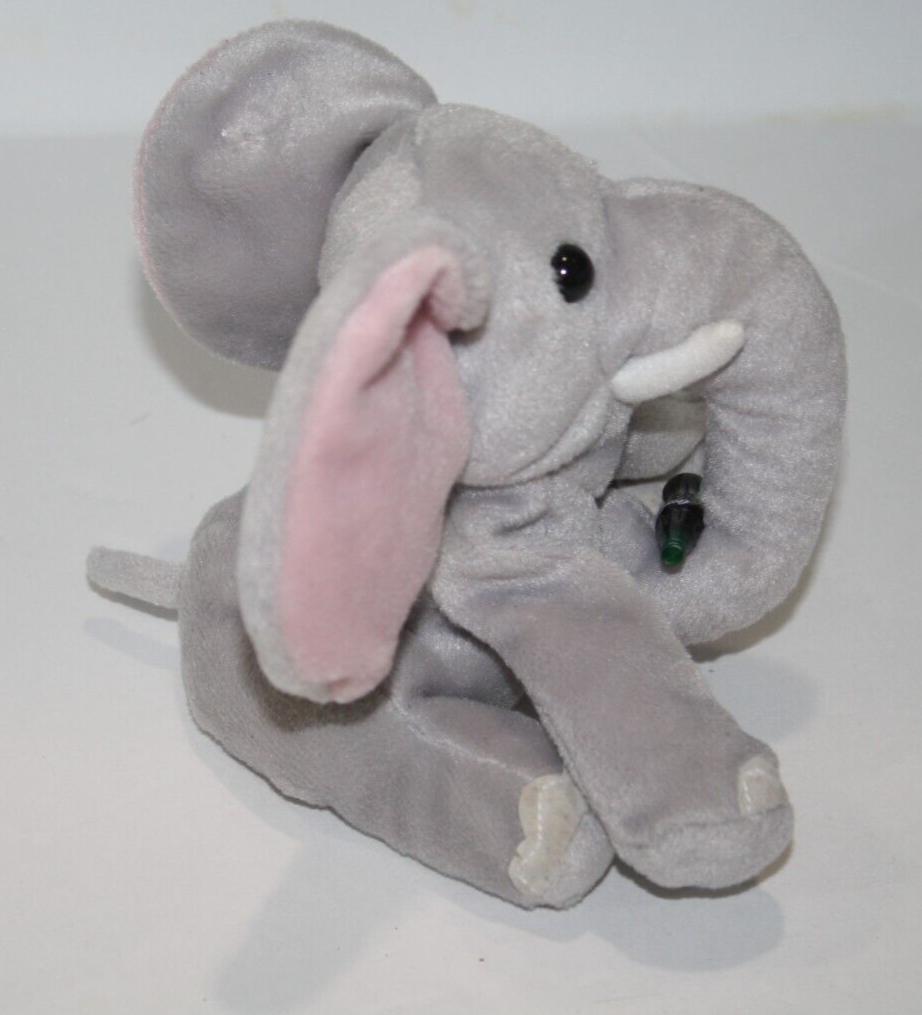 Clomp the Elephant has Black plastic eyes and a Small Plastic Bottle of Coca Cola attached to her trunk, Bean bag with soft plush material