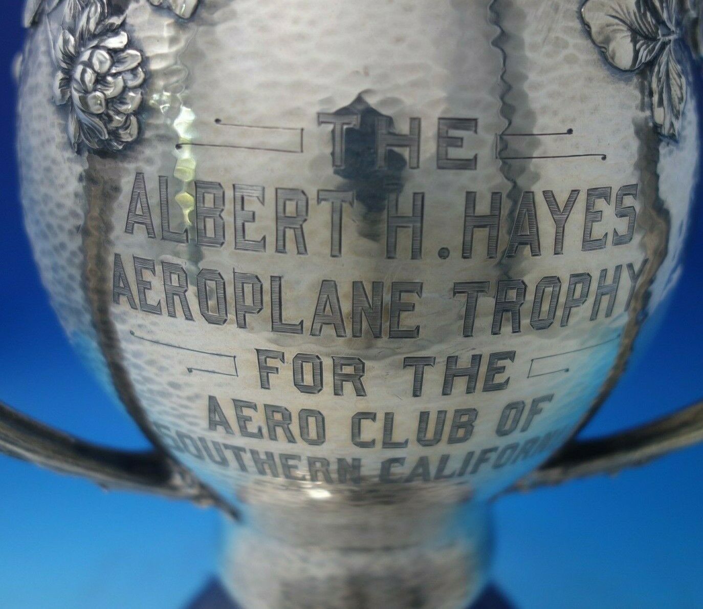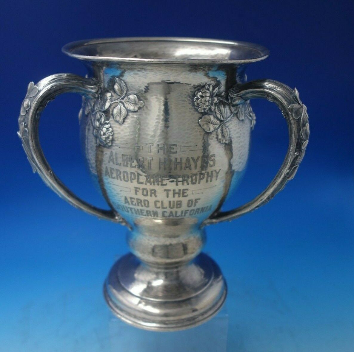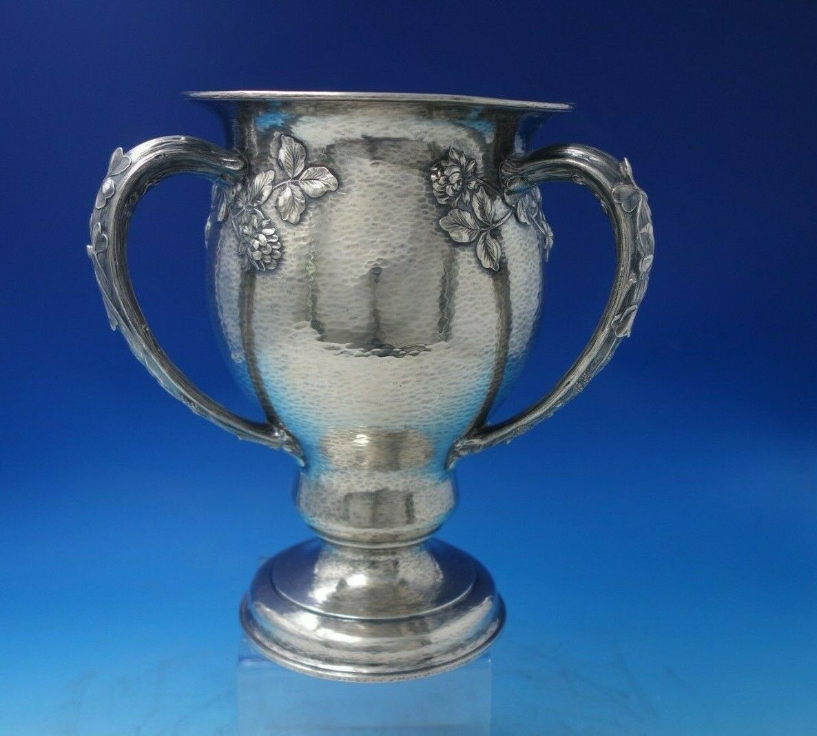 Magnificent Clover by Gorham sterling silver hand hammered three-handle champagne cooler trophy marked #A5042. This piece holds 6 1/2" pints, measures 10 1/4" x 9", and weighs 53.2 troy ounces. Hand hammered and inscribed for Aero Club of Southern California, dated 1906. It has an inscription on the side (see photos), and is in good vintage condition. Extraordinary piece!
