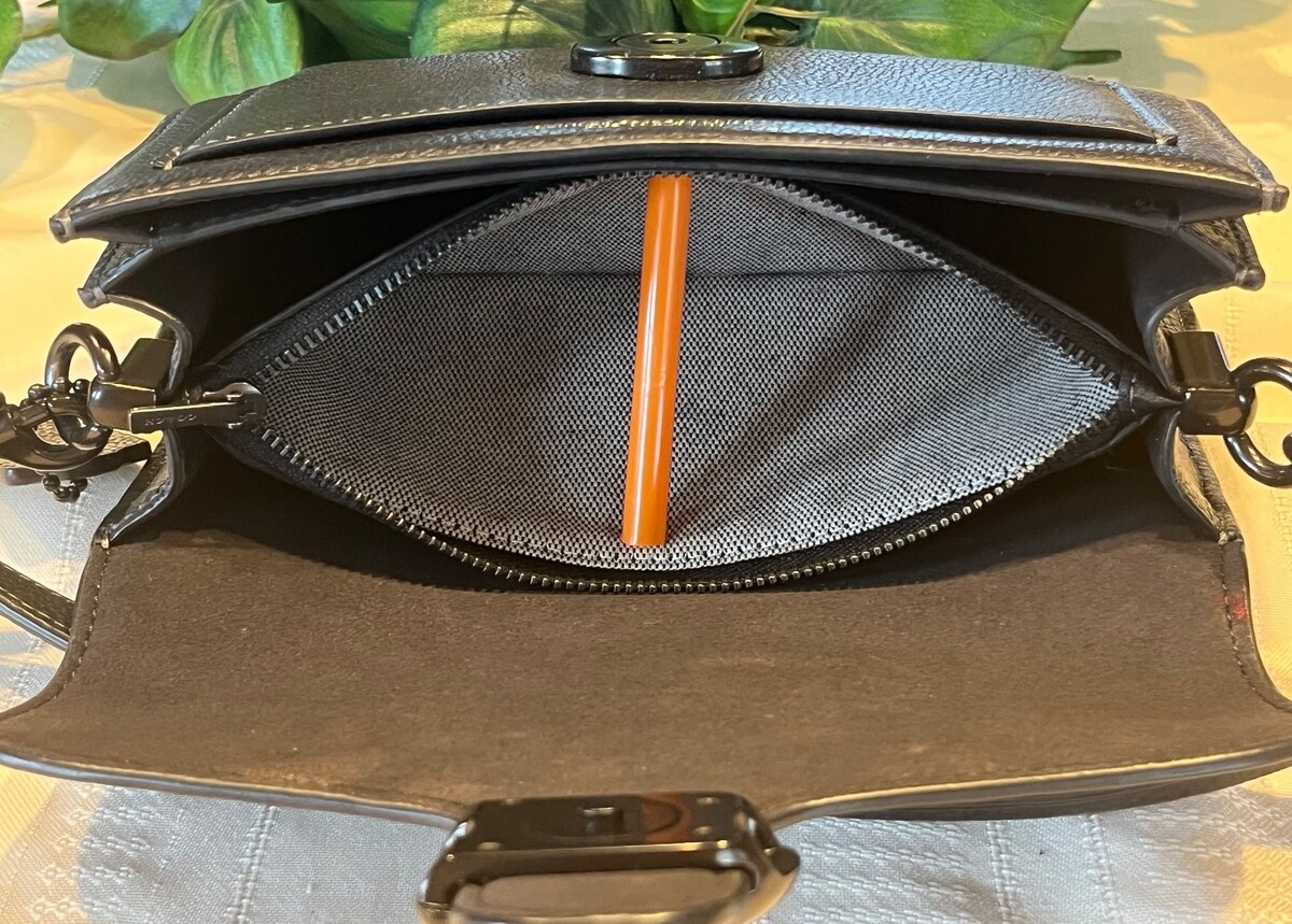 Construction: Pebbled leather with gunmetal (gray) hardware and brushed fabric lining and woven fabric on inside pocket