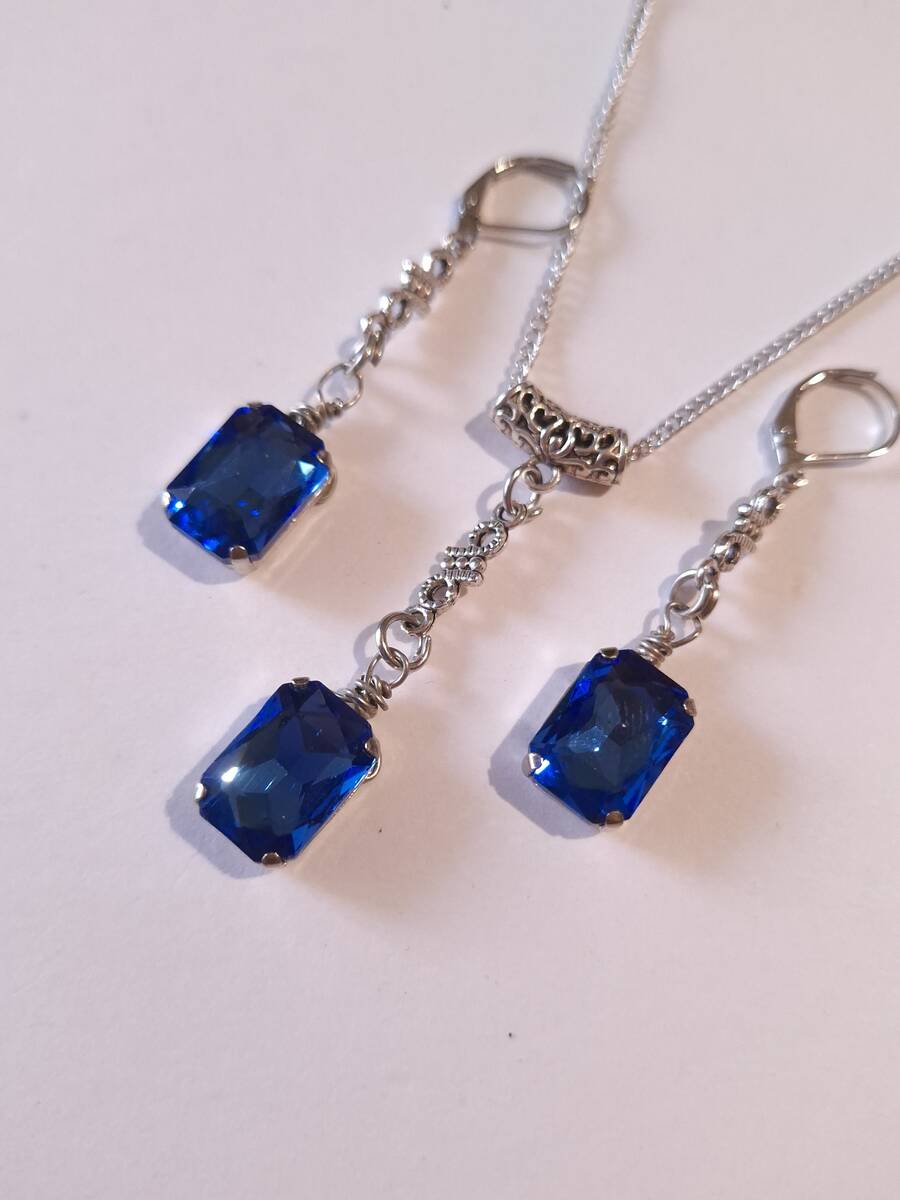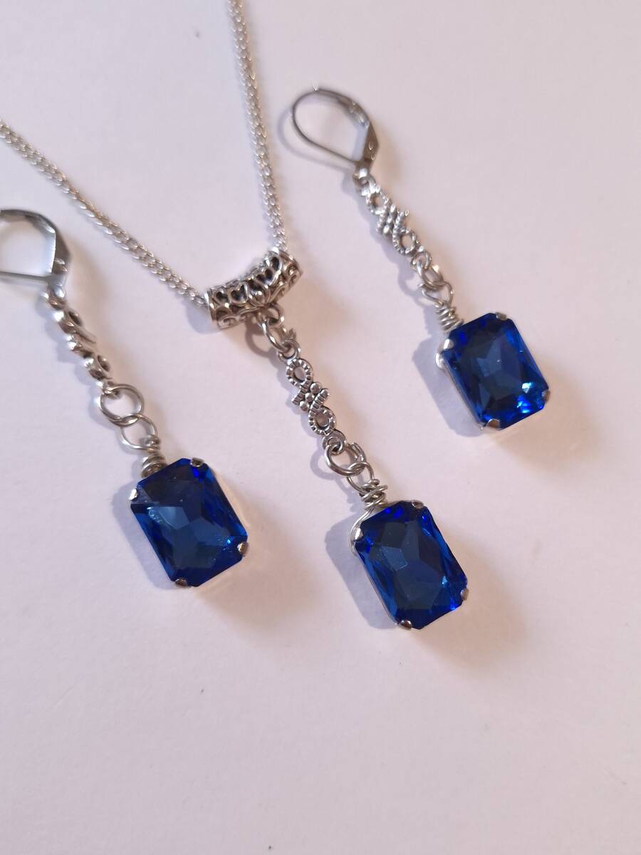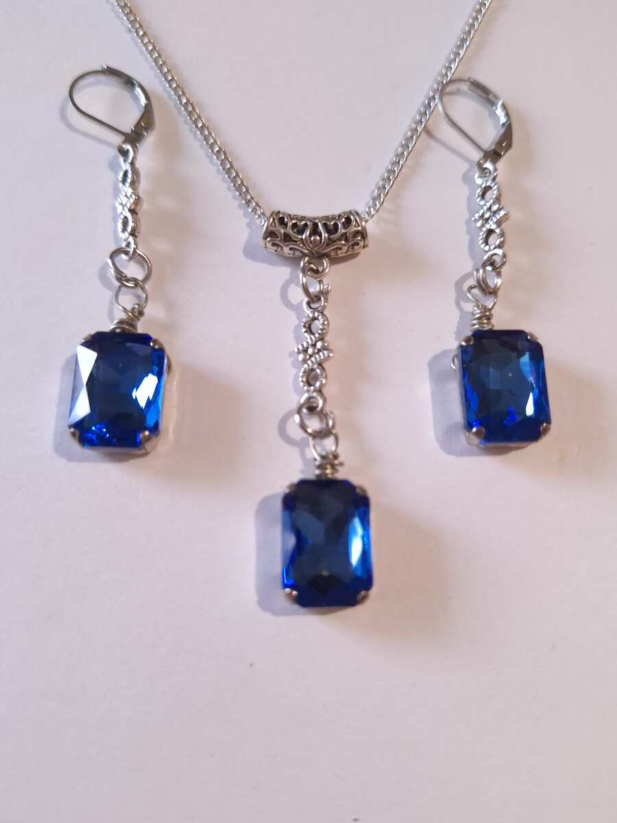Beautiful Set of silver-tone Antique style Cobalt Blue necklace and earrings. Silver tone pendant Victorian style necklace and earrings. Boho necklace. Bohemian necklace and earrings. Romantic necklace and earrings. Beautiful necklace with same style earrings with Royal blue faux crystals beads.
