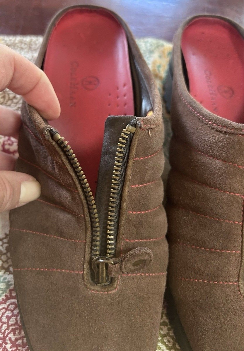 - Cole Haan Air Suede Clogs Women’s 10 Brown Comfort Decorative Zip Slip-On Shoes
