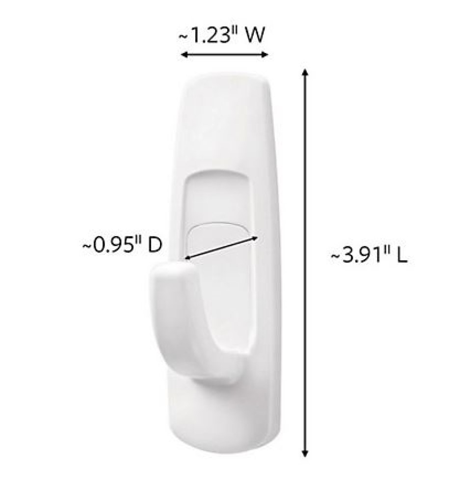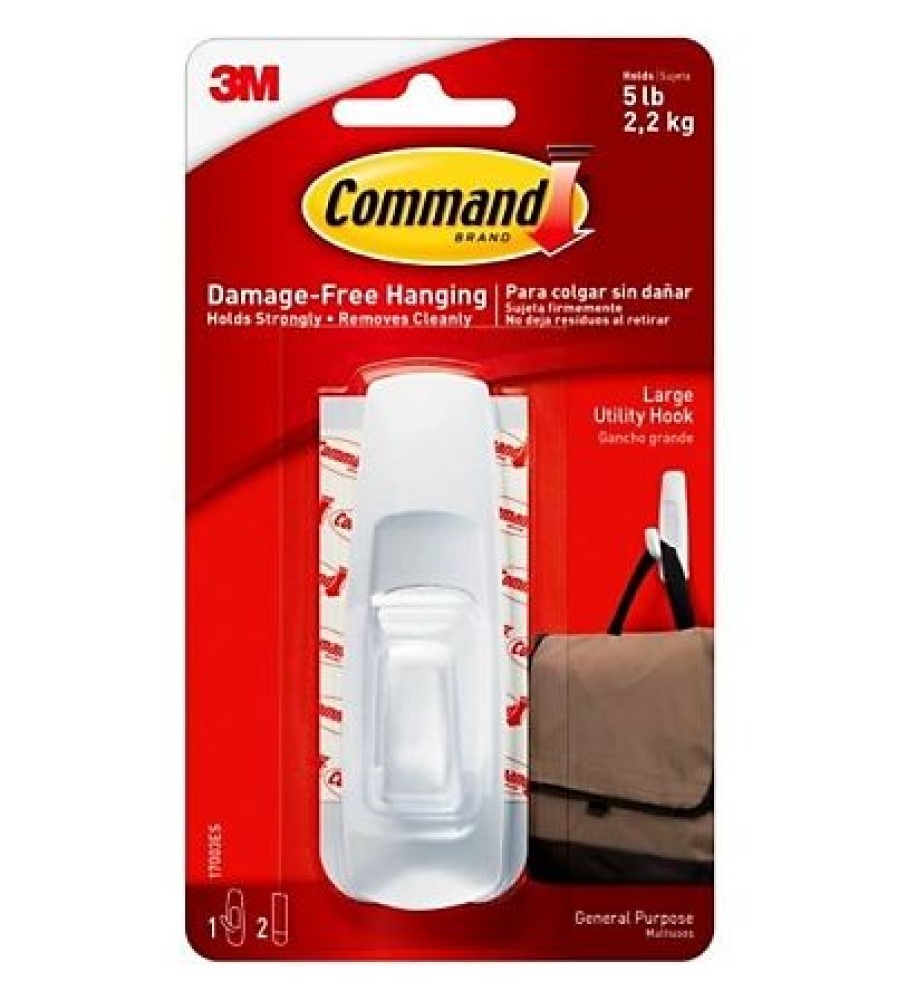 INCLUDES - 1 Large, white Command Utility Hook and 2 Large Command Strips; 1 hook holds up to 5 lbs DAMAGE-FREE ORGANIZATION- Say goodbye to holes, marks, or sticky residue on your walls, doors, cabinets, or closets; Command Hooks by 3M are easy to use and help keep your walls looking beautiful NO TOOLS REQUIRED- Hang clipboards, brushes, dog leashes, kitchen utensils, and accessories where you want without nails or a hammer REMOVES CLEANLY- Reorganize when inspiration strikes; These wall hooks leave no sticky adhesive behind; Perfect to use inside cabinets and closets, in your college dorm, apartment, home, and office