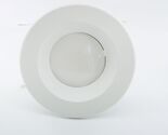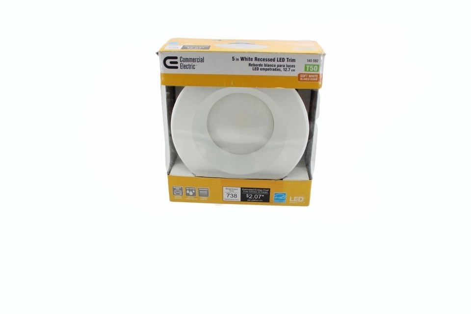 The Commercial Electric 5" White LED Recessed Trim is a modern and energy-efficient lighting fixture designed for various rooms in a home or office. With a sleek white color and a 5-inch diameter, this trim is suitable for use in bathrooms, bedrooms, living rooms, kitchens, and more. The LED lighting technology provides bright illumination while using less energy than traditional incandescent bulbs. This trim is a versatile and stylish option for adding lighting to any space.