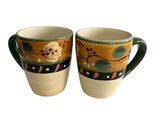 Pair of handcrafted Corsica Home ?Brigette? stoneware mugs featuring a warm folk-art floral design in earthy tones with green handles. These mugs date to the **early 2000s** and show interior crazing consistent with age and use (see photos). Still display beautifully and function well. Microwave-safe (will get hot) and dishwasher-safe.