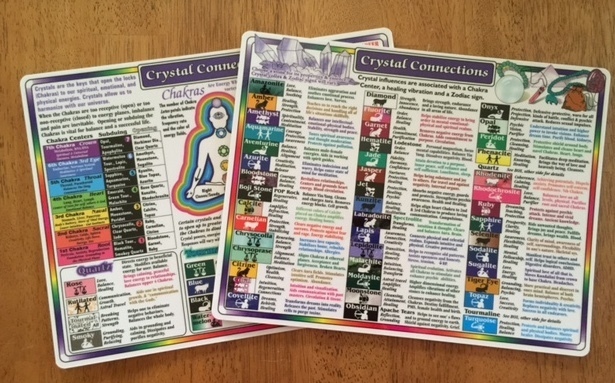 This chart features therapeutic properties of crystals, chakra correspondences, and influences of 44 crystals.