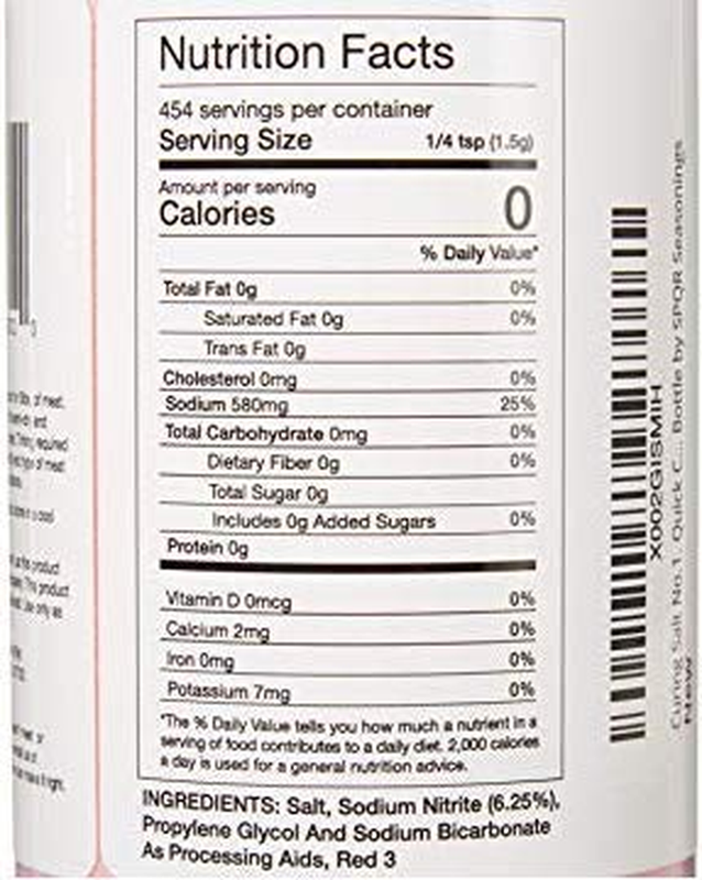 Pink Curing Salt #1 is generally used to wet-cure any type of meat (for 30 days or less) that requires cooking before consumption. SPQR Seasonings, Pink Curing Salt #1 is perfect for both curing and preserving sausages, white fish, all kinds of bacon, salami, jerky, brisket, pastrami, poultry and much more. This XL bottle contains enough pink curing salt to cure hundreds of pounds of meat, in an easy to store container.