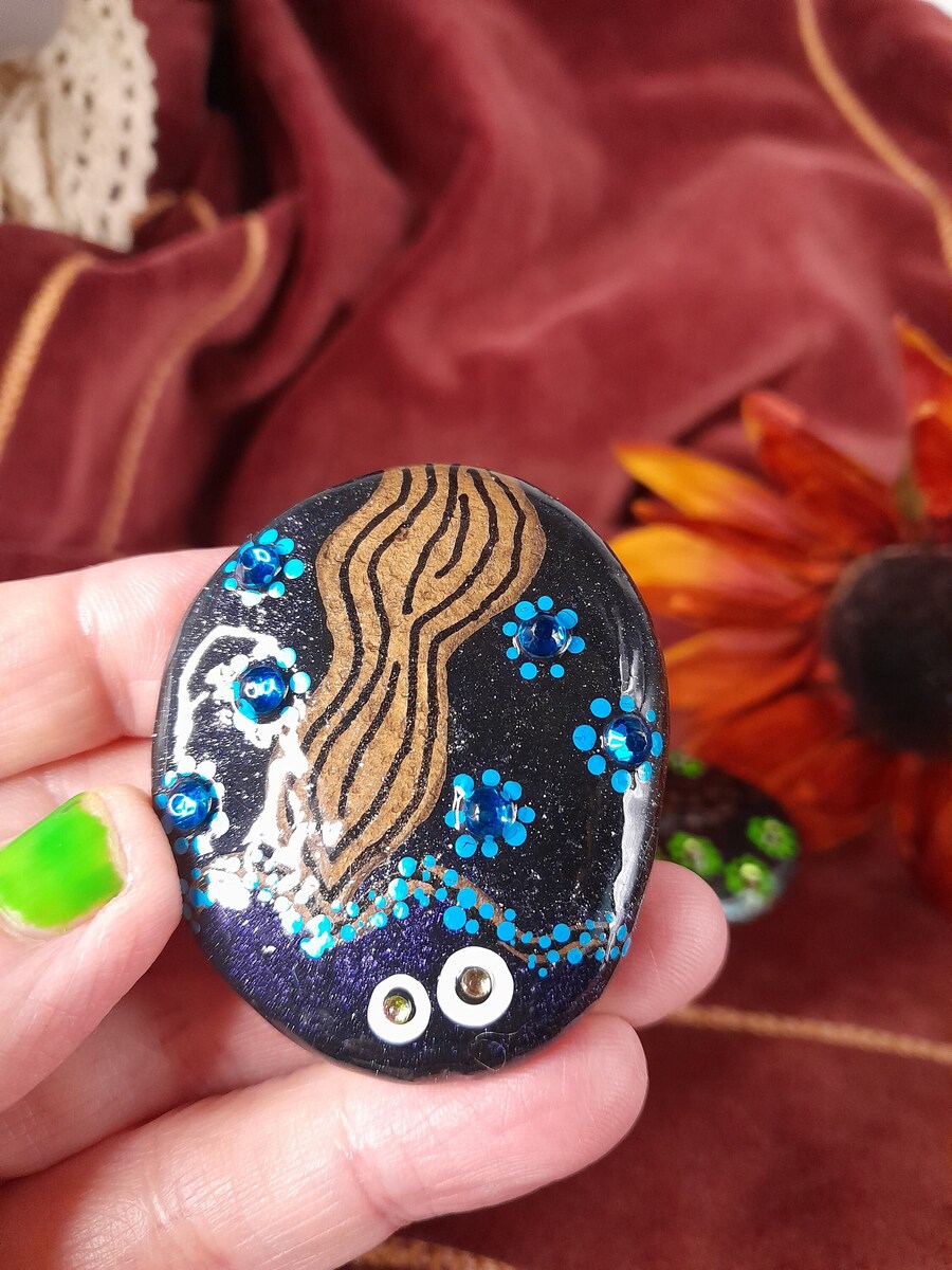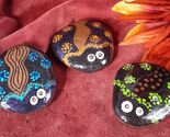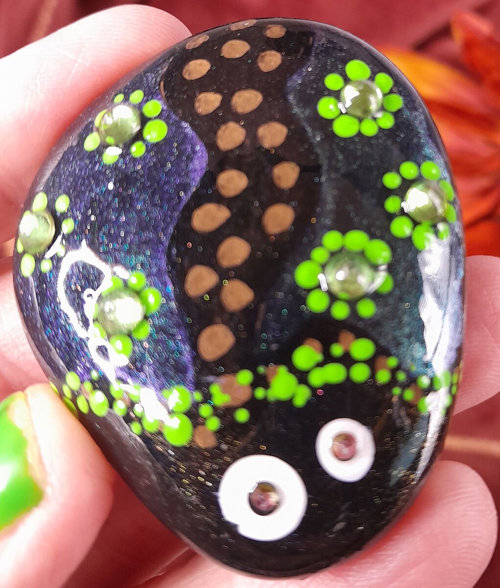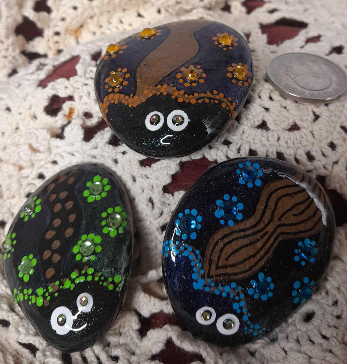 A cute set. This adorable set of 3 Buggy Beetles will be adorable for so many uses. Gorgeous shift changing paints and glitters adorn these Rocks, then we seal them in resin - so, perfect for indoor or out. Coin in photo to show scale. This Rock set does not come with stands.