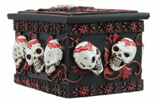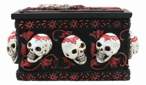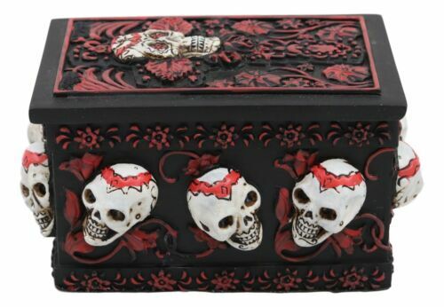 ? This bizarre box is a must have for any Day Of the Dead Occasion! It features a rectangular box etched with beautiful red floral patterns while adorned with white skulls all around and on the lid of the box.
