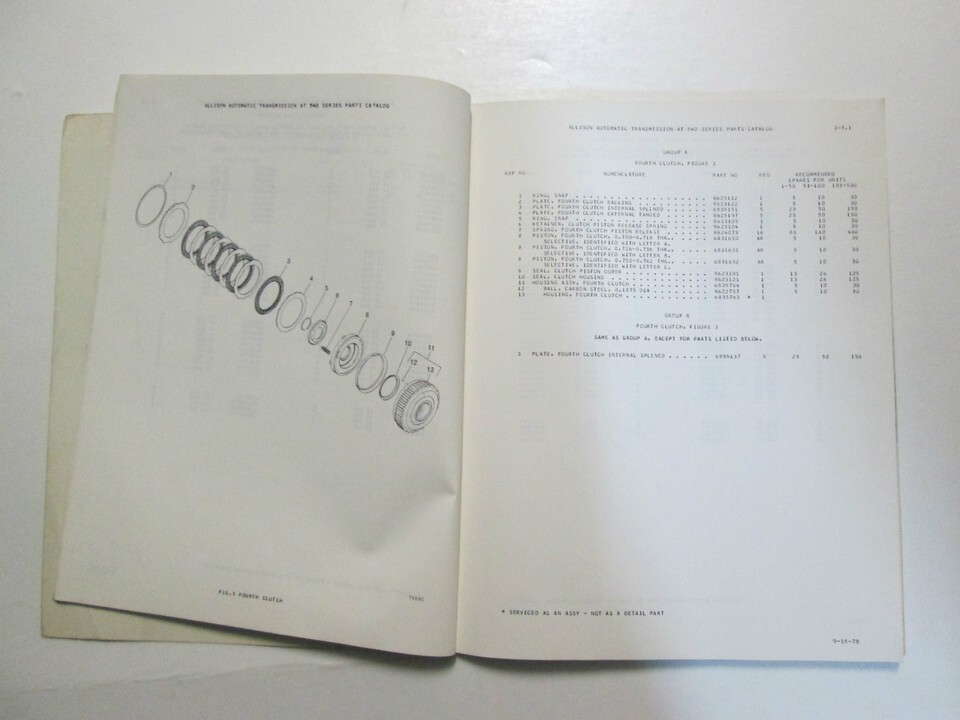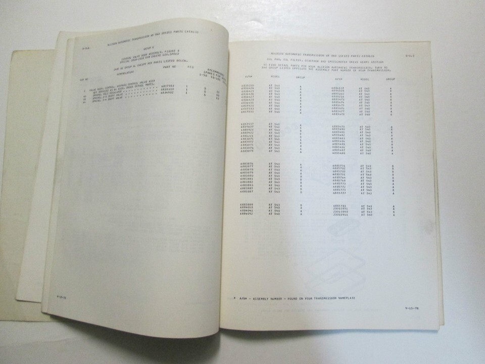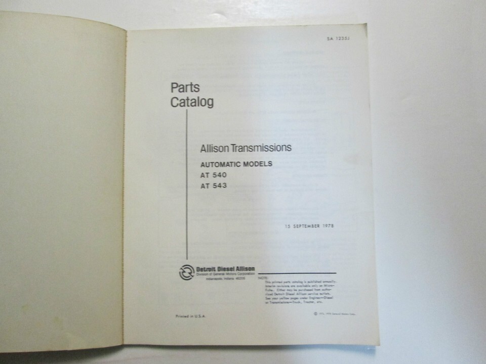 Detroit Diesel Allison Transmissions AT 540 Series Parts Catalog SA 1128P September 15, 1978 Automatic Models: AT 540 AT 543 Note: Parts Catalog is in ok condition. Please see photo's. Any questions please contact us prior to purchasing. Selling As Is We ship everywhere, we offer combined shipping, we don't offer local pick up. Orders are usually shipped within 1 weekday of receiving payment. We ship every weekday, shipping times are estimates only, and are not guaranteed by the post office. If you have further questions feel free to message us or call us at FEEDBACK We will leave POSITIVE Feedback after we receive your payment. Please do not forget to give us POSITIVE Feedback and FIVE STARS on all of the Detailed Seller Ratings! If you are not satisfied with your shopping Experience, please contact us to get a solution before you decide to leave a NEUTRAL or a NEGATIVE Feedback, We will do our best to solve any problems for you as soon as possible. We will provide you with the BEST POSSIBLE service because the POSITIVE Feedback and FIVE STARS are what we are striving for. Please email me through "My Messages" or "Ask Seller Questions" if you have any question about our listings or your purchase. Please give us a Five Star Rating! Thank you very much! CC 1/7/2014 Track Page Views With Auctiva's FREE Counter
