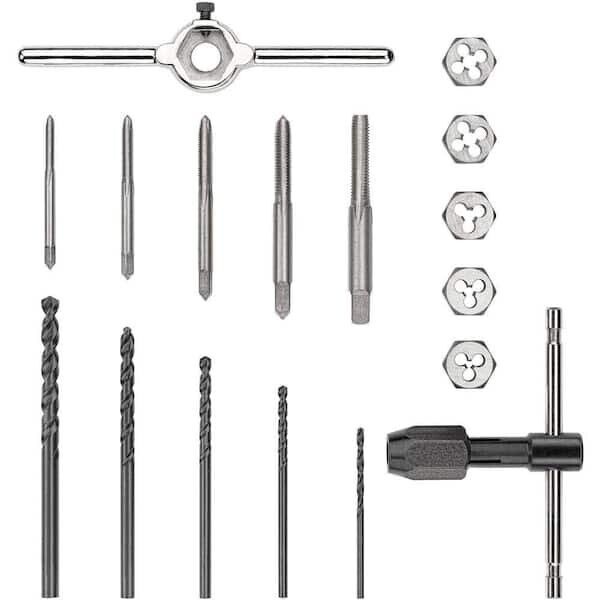 You are Buying a Brand New And factory Sealed Dewalt 17 Piece Fractional Tap And Hex Die Set Model # DWA1451..... the black oxide drill bits are designed for long life. Includes 1 of each of the following: 6-32 tap, 8-32 tap, 10-24 tap, 10-32 tap, 1/4 in.-20 tap, 6-32 die, 8-32 die, 10-24 die, 10-32 die, 1/4 in.-20 die, # 36 drill bit, #29 drill bit, #25 drill bit, #21 drill bit, #7 drill bit for, 1/4 in. tap handle, 5/8 in. hex die handle. Black oxide split-point drill bits for resistance to wear and tear. High carbon steel hexagon dies for cutting internal and external threads. Designed for precision. 17-piece set, Handles included.......