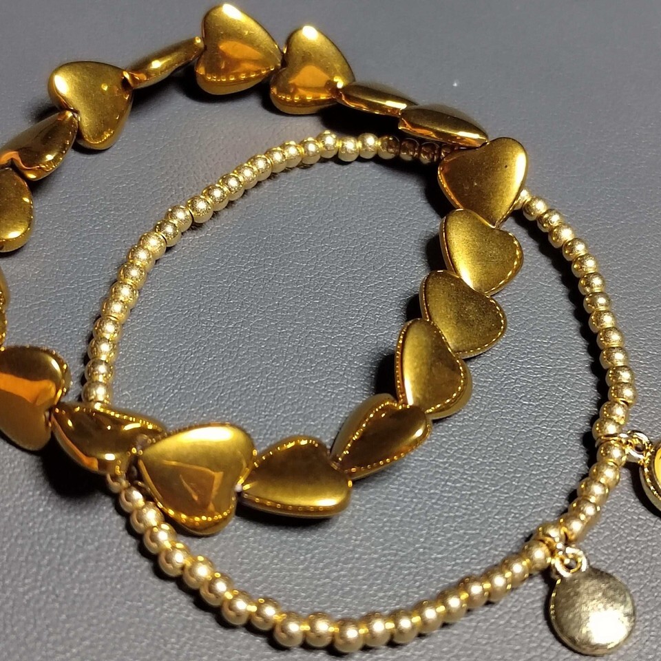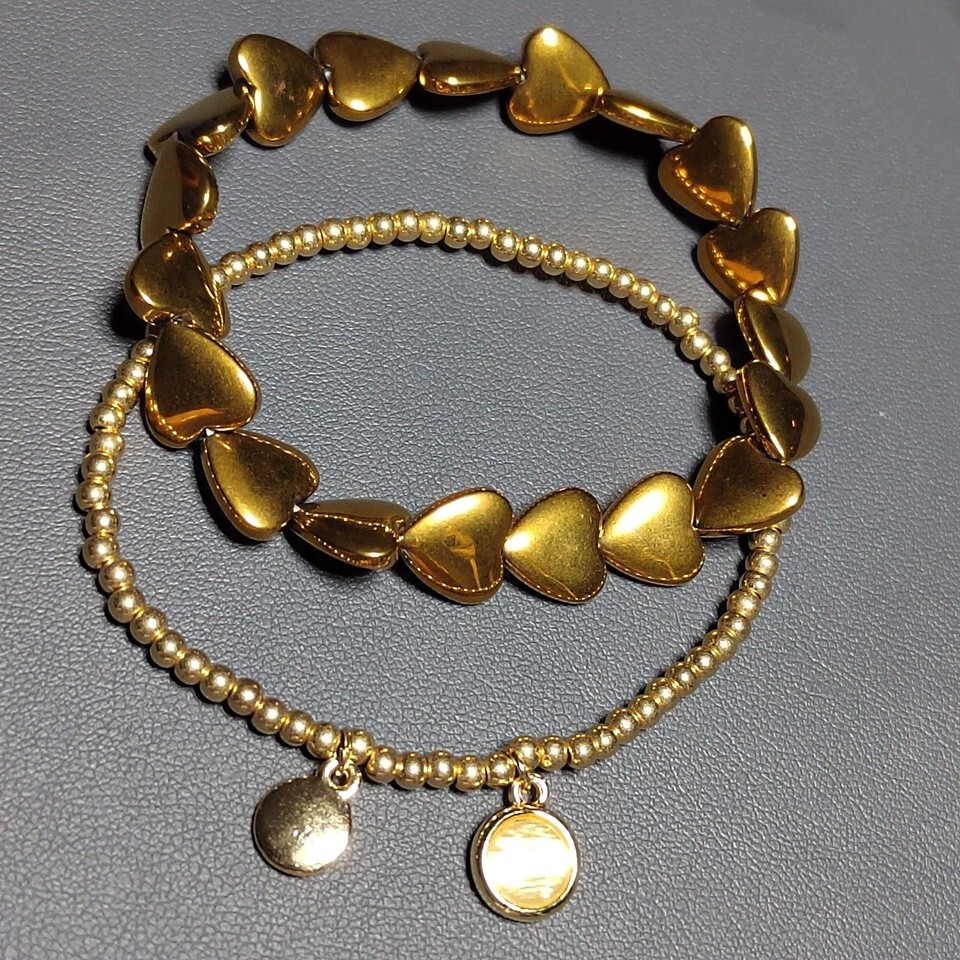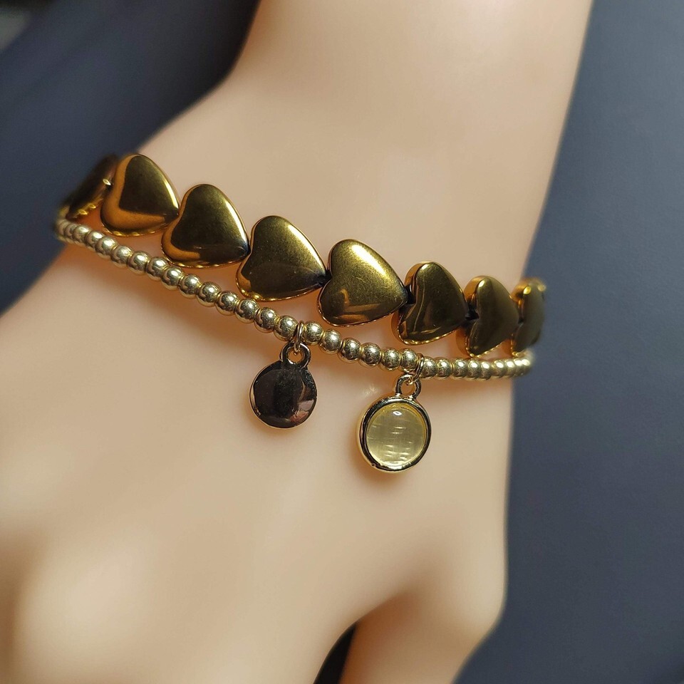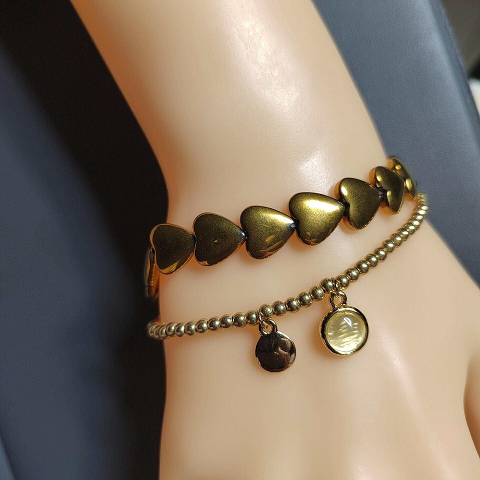 ? Double Layer Natural Pyrite Bead Bracelet Love-Shaped Accent Gold or Silver Options 17cm Stretchable Fit Chic Layered Design for Casual Formal WearAdd a touch of elegance and charm to your jewelry collection with this Double Layer Natural Pyrite Bracelet, featuring a unique blend of love-shaped beads and high-quality gold or silver-plated accents. The layered design combines texture and dimension, making it a stylish choice for both casual outings and formal occasions.Crafted with natural pyrite beads, known for their metallic luster and grounding energy, this bracelet offers a modern aesthetic with symbolic warmth?perfect for gifting or personal wear. ? Why You?ll Love It? Unique double-layer design with love-shaped and round pyrite beads? Available in two stunning combinations: Gold or Silver accents? Natural pyrite offers a chic metallic sheen and grounding energy? Stretchable 17cm fit for comfort and flexibility? Versatile styling for everyday wear, parties, or elegant events ? Product Details? Material: Natural Pyrite, Gold/Silver-Plated Beads? Bead Shape: Love-shaped and round? Bead Size: Approx. 10.4 10.6 mm? Bracelet Size: Approx. 17 cm (stretchable fit)? Color Options: Gold or Silver bead combinations? Style: Double-layer bracelet for casual, formal, or party wear ? Packaging Includes? Elegant Jewelry Box? Velvet Jewelry Pouch? Cleaning Cloth? Zip Lock Bag for safe storage ? Care Instructions? Avoid contact with perfumes, hairsprays, and harsh chemicals? Store in the provided pouch or zip lock bag to prevent scratches and dust? Clean gently with a soft cloth; avoid abrasive materials? Remove during swimming or strenuous activity? Periodically inspect and consult a jeweler for maintenance ? A symbol of love, style, and strength?this bracelet is perfect for those who appreciate layered elegance and meaningful design.