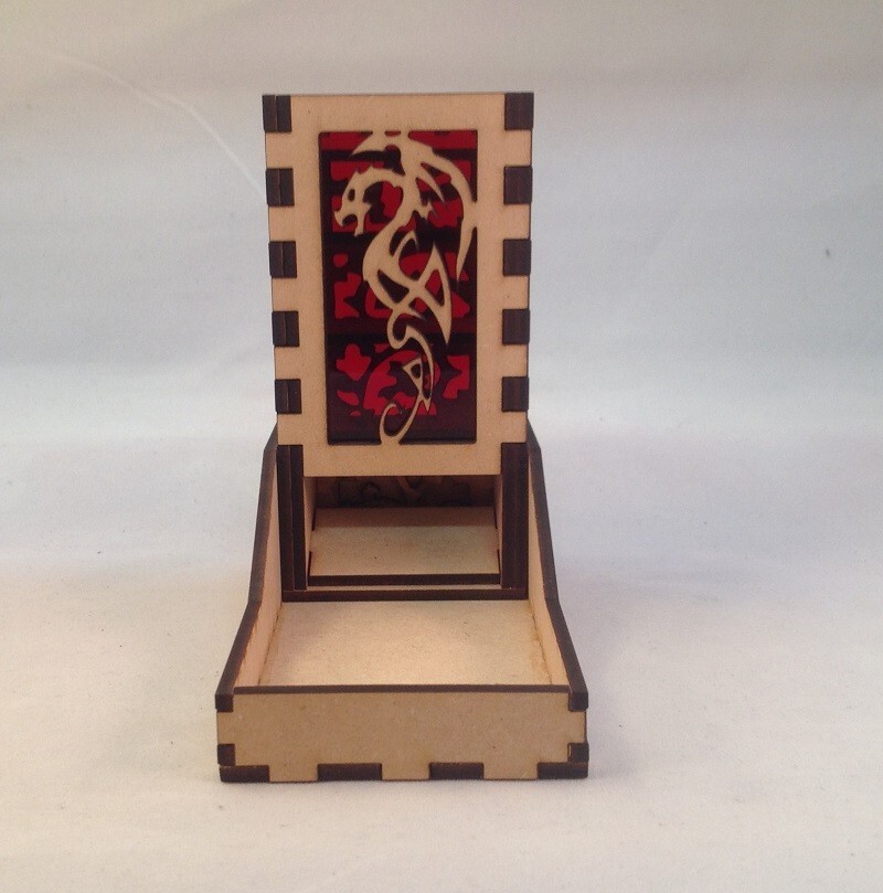 - Dragon v4 Dice Tower and Tray Red Acrylic Window COMPACT DESIGN Laser Cut MDF