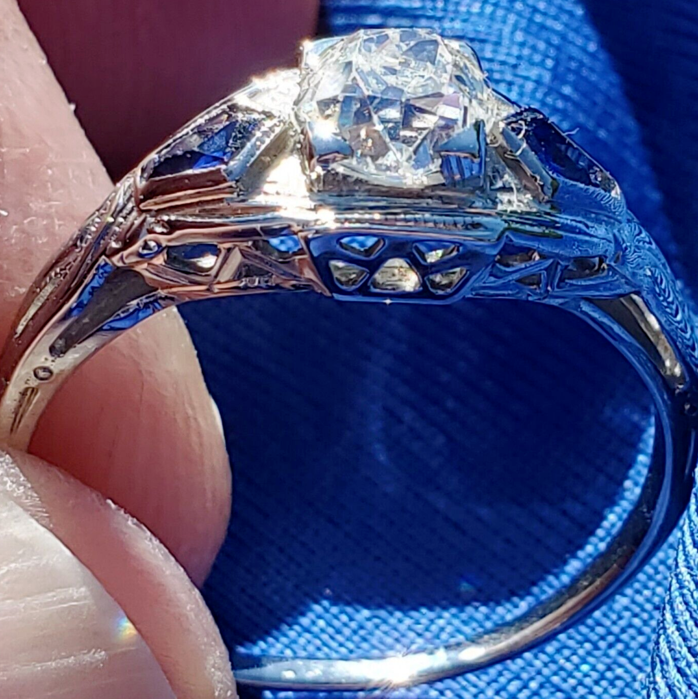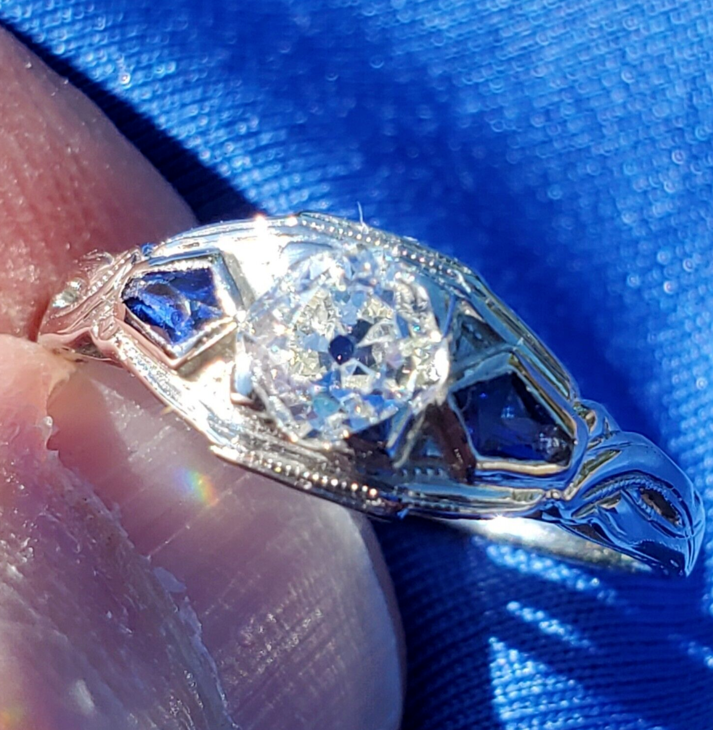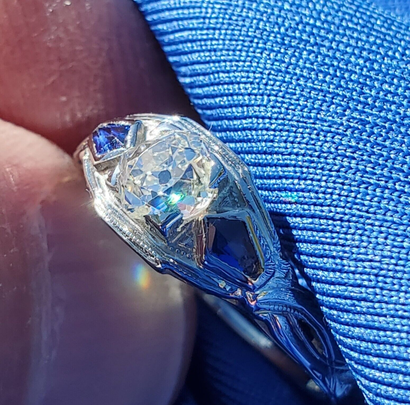 - Earth mined Diamond Sapphire Engagement Ring Vintage 18k White Gold Solitare 7.5