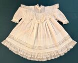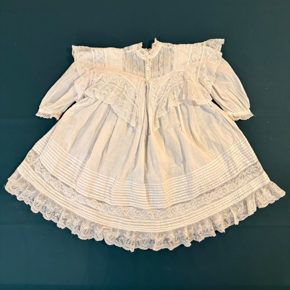 Delicate Nottingham-style floral net lace trims the yoke and hem, still supple after over a century. Honest age evidence only?a faint pinhole near the collar, slight seam opening, and minor ruffle separation. Measures about 21oe" long 9oe" shoulder. A genuine heirloom for collectors, historians, or heritage display?graceful and handmade.