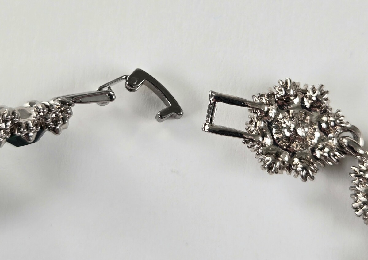 Make a bold statement with this breathtaking vintage emerald green rhinestone choker necklace. Captures the glamour of mid-century costume jewelry with the striking floral cluster link design in gleaming silver tone metal. Whether for prom, a wedding or a formal event this collar necklace delivers maximum impact and sparkle. Perfect as a unique statement jewelry gift, ships nestled in a box ready for a bow.