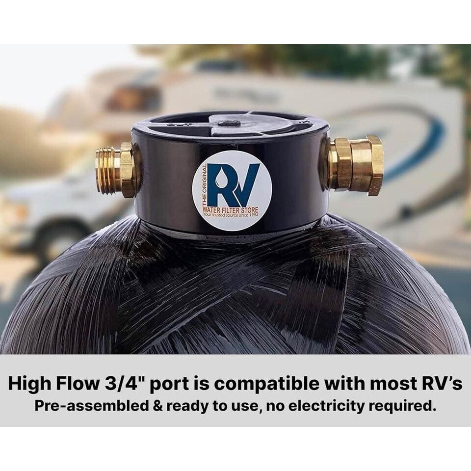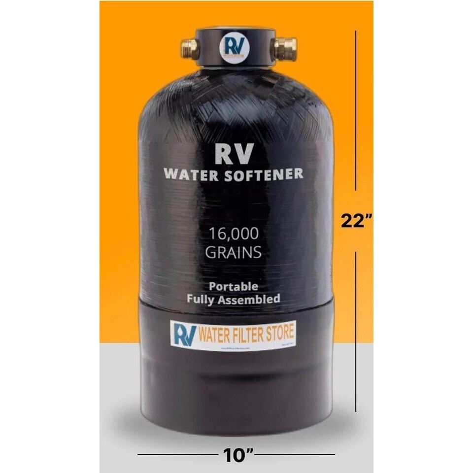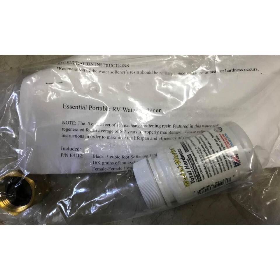 Open box and unused! Still in box see photos. Box may have some wear/tear Essential RV Water Softener Portable 16,000 Grain w Custom Hose, Long Lasting for RVers Vanlife, 3/4" Fittings, Softens Hard Water When Traveling or Mobile Spot Reducing Car Washing This RV water softener is pre-assembled and features a 3/4" High Flow port and a 16,000 grain capacity for up to 60 days(2000+ gallons) of softened water; ready to go, no electricity required. With low maintenance and easy installation, a 5 year old could do it. Features a rugged NSF Polyethylene tank covered with fiberglass with a 10 3/8" base for stability; Inner contents include NSF 16000 Grain Resin which reduces Calcium, Magnesium, Iron, Lead, Radium, and others. Ready to use right out of the box with the Custom No Kink Water Hose (Included). Easily connect to any water hose connection typically found in campgrounds and parks. Recharge with Table Salt- 2000+ Gallons per charge 1