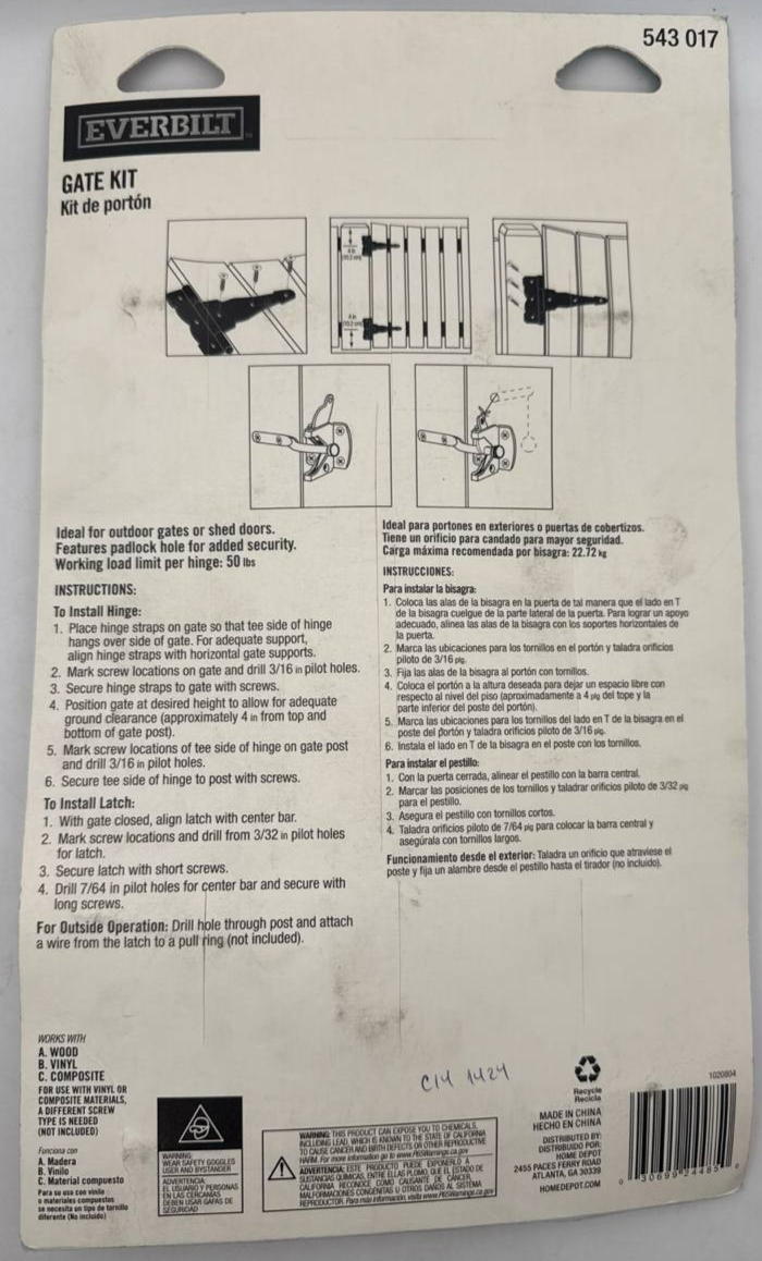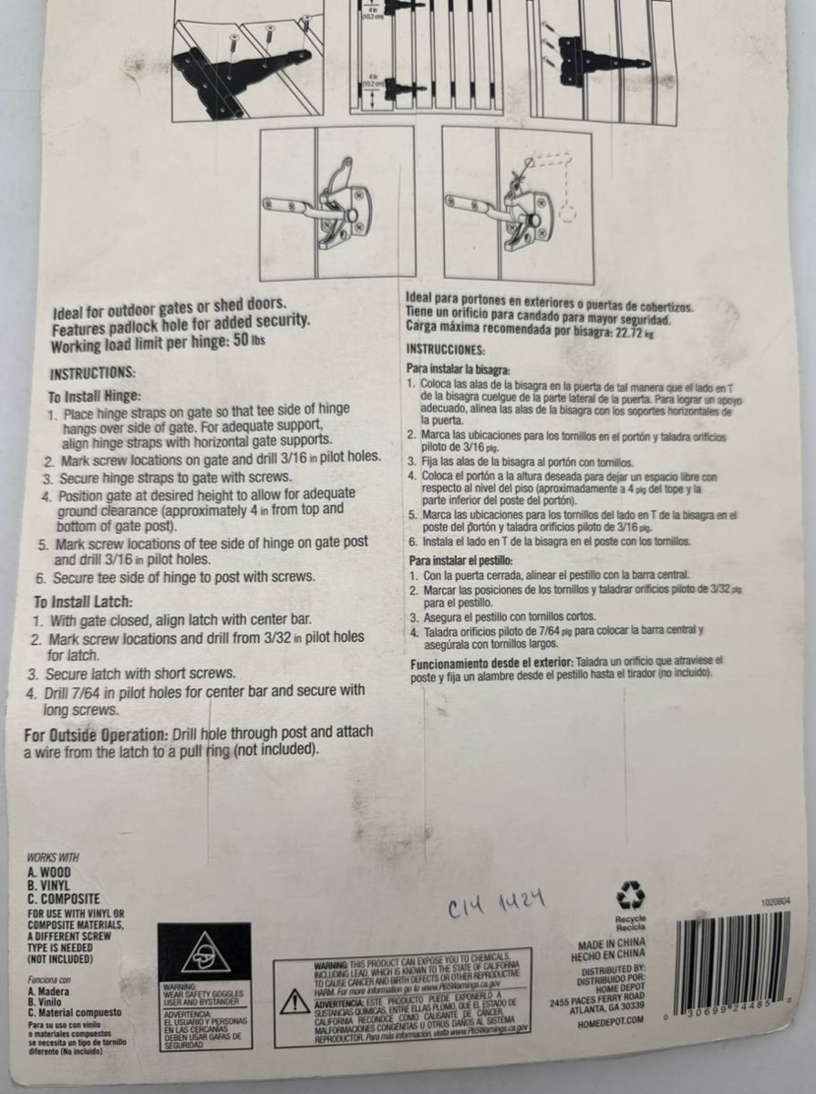 Compatibility: Designed for use on outdoor residential gates, shed doors, or fence panels requiring surface-mount hardware. Ideal for inward or outward swinging pedestrian gates. Compatible with wood, vinyl or composite gate material.