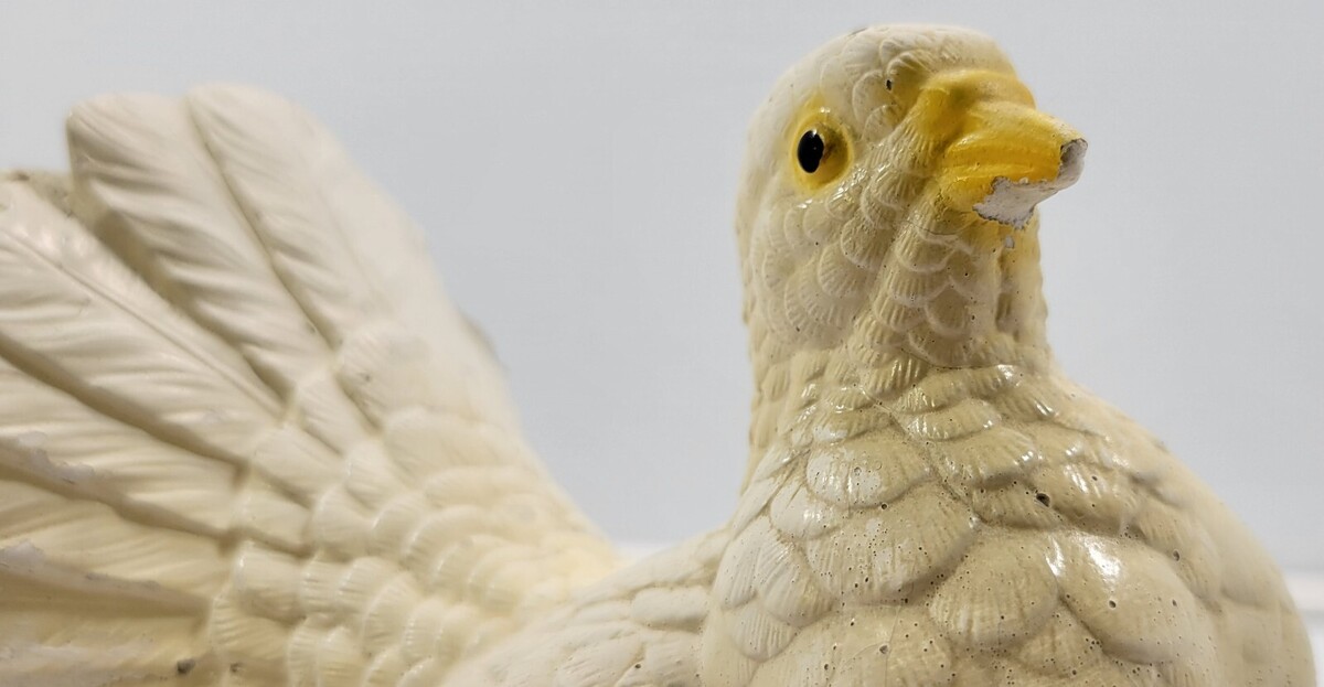 Vintage Heavy Ceramic Fantail Dove Bird Statue Figurine Measures about 6-1/2" x 5-1/4" x 6" high Heavy figurine is roughly 2lbs Figurine is in rough vintage condition with significant signs of age, use and repair including some chips, cracks and paint flaking. It was displayed and stored in a summer home for years. Good candidate for restoration.