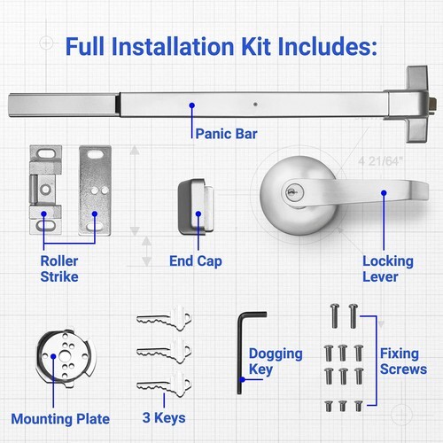 FORTSTRONG 31" Commercial Panic Exit Device - UL Listed, ADA Certified (Silver) PRODUCT DESCRIPTION The FORTSTRONG 31" Commercial Push Bar Panic Exit Device is a robust and reliable solution designed to provide easy and safe exits in emergencies. Ideal for commercial, industrial, and residential properties, this panic exit device ensures quick and smooth door release. Featuring high-quality, durable materials and designed for high-traffic areas, it meets rigorous safety standards and is UL Listed and ADA Certified, offering peace of mind for building owners and occupants. It?s the ideal choice for businesses seeking to enhance the safety of their properties. FEATURES: * UL Listed Grade 1: Certified for durability and reliability in high-traffic areas. * ADA Certified: Complies with the Americans with Disabilities Act, ensuring accessibility for all users. * Complete Assembly Kit: Includes a retractable dogging key, roller strike, shim, fixing screws, thru bolts, and three security keys. * Simple Setup: Designed for easy and quick installation, ensuring a hassle-free setup process. * Durable Construction: Made with high-quality materials to withstand frequent use. Condition: Open Box Color: Silver Copyright All rights reserved.
