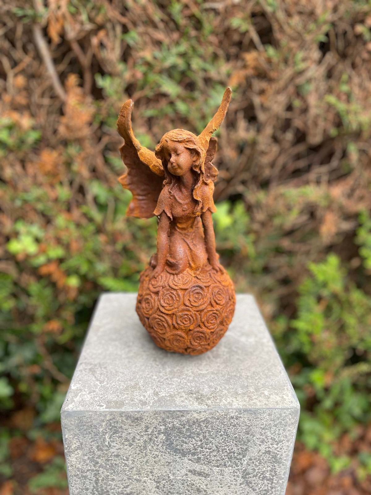 This whimsical iron sculpture features a delicate fairy perched atop a blooming sphere of roses. With finely textured wings and flowing hair, the figure sits in quiet contemplation, blending the fantasy of fairytale imagery with the strength of cast iron. The rich rusted finish adds character and depth, making this sculpture a charming and imaginative accent for gardens, balconies, or rustic interior spaces. It brings a touch of enchantment to any setting, celebrating nature, dreams, and delicate beauty.