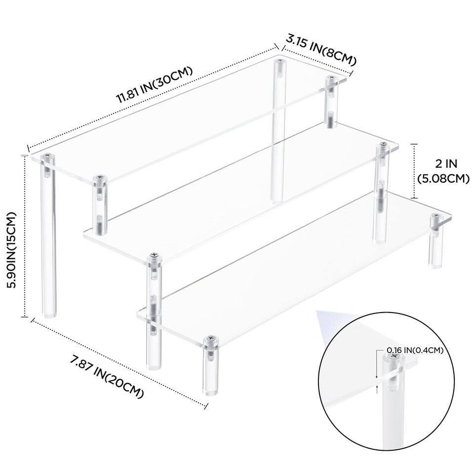 About this item ?Multi-function Stand?Acrylic display risers can keep your things organized, saves space. You can find them quickly and easily, no more searching messy drawers, all of your things. Acrylic risers for display shelves are easy to place, fit on your dresser, table organization, funko pop display case, party, kitchen, shop,and are also suitable for all colors or themes of the room. ?Size Quality Package?Every acrylic panel is 11.81" long and 3.15" wide, the height of each tier is 2", the total height is 5.9". All items are individually wrapped in a protective bubble film to prevent scratching and rubbing.there are protective film on the both side of acrylic board, please peel it off before using. ?Durable and Strong?Unlike other fragile plastic display risers, Famyards clear risers using 4mm thick high transparent acrylic, extra durability, and long-lasting service life.And not esy to bend in th middle, can withstand heavier items. ?Easy to Install and Clean?The perfume organizer stand is easy to install, and the instruction and a screwdriver is included in the package, it can be installed quickly in just a few steps. This is a practical riser stand that is easy to clean, assemble and disassemble for storage. ?Acrylic Riser Display?3 tier cupcake stand is simple design and durable, provides enough space to cologne perfume, cosmetic, skincare lotion, Amiibo Funko POP Figure, dessert, cupcake risers,jewelry, collectibles and etc.