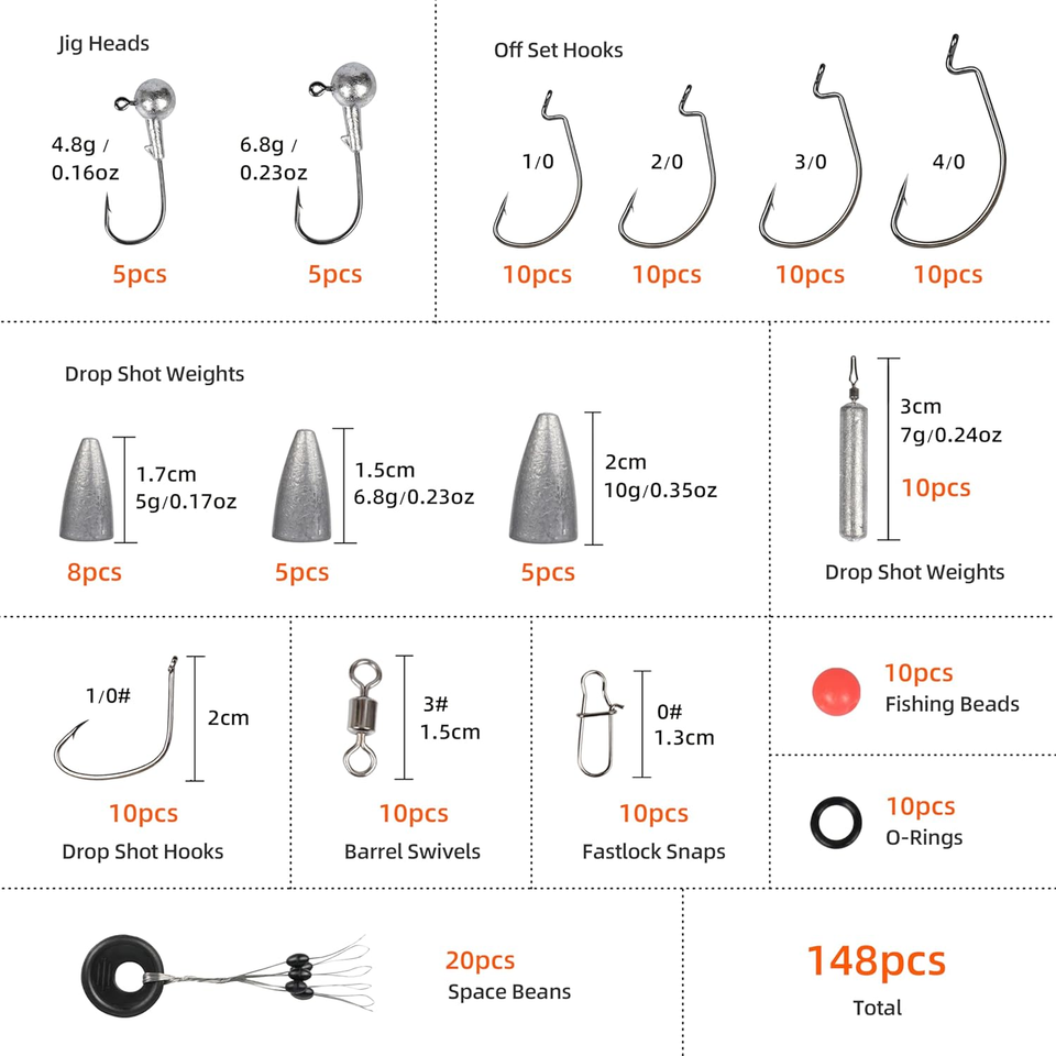 Huge Variety: The fishing tackle comes in sensible blend, includes off-set hooks, drop shot hooks, bullet weights, drop shot weights, jig heads, barrel swivels, fastlock snaps, fishing beads and space beans, suitable for all sorts of fishing conditions!