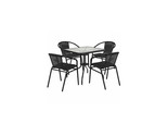 Features Table and Chair Set Set Includes Table and 4 Chairs Designed for Indoor and Outdoor Use Designed for Commercial and Residential Use Square Table 5mm Thick Glass 1.375'' Edge Top Decorative Black Rattan Edge Band Black Powder Coat Finish Protective Plastic Floor Glides Stackable Cafe Chair 352 lb. Weight Capacity Stacks up to 23 Chairs High Lightweight Design Curved Back Black Rattan Seat and Back Integrated Arms Cross Braces provide extra stability Black Powder Coated Frame Finish Plastic Floor Glides Specifications Shape: Round Base Size: 25.5'' W Color: Black Dimension: 27.5 H x 28 W x 28 L Weight: 56 lbs