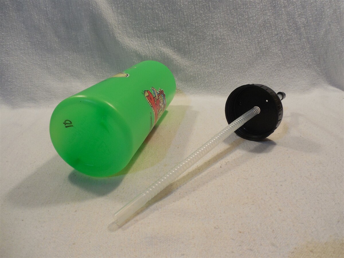 This is a Flintstones 1990 Hamilton Projects Inc. plastic drink bottle with straw. The green bottle pictures Fred Wilma Flintstone and Barney Betty Rubble in the Flintmobile...the same picture is on 2 sides of the bottle. The bottle stands approximately 9" tall to the top of the removable lid. The removable straw is approximately 13" long. The bottle is marked Betras Plastics Inc on the side. Powered by SixBit's eCommerce Solution