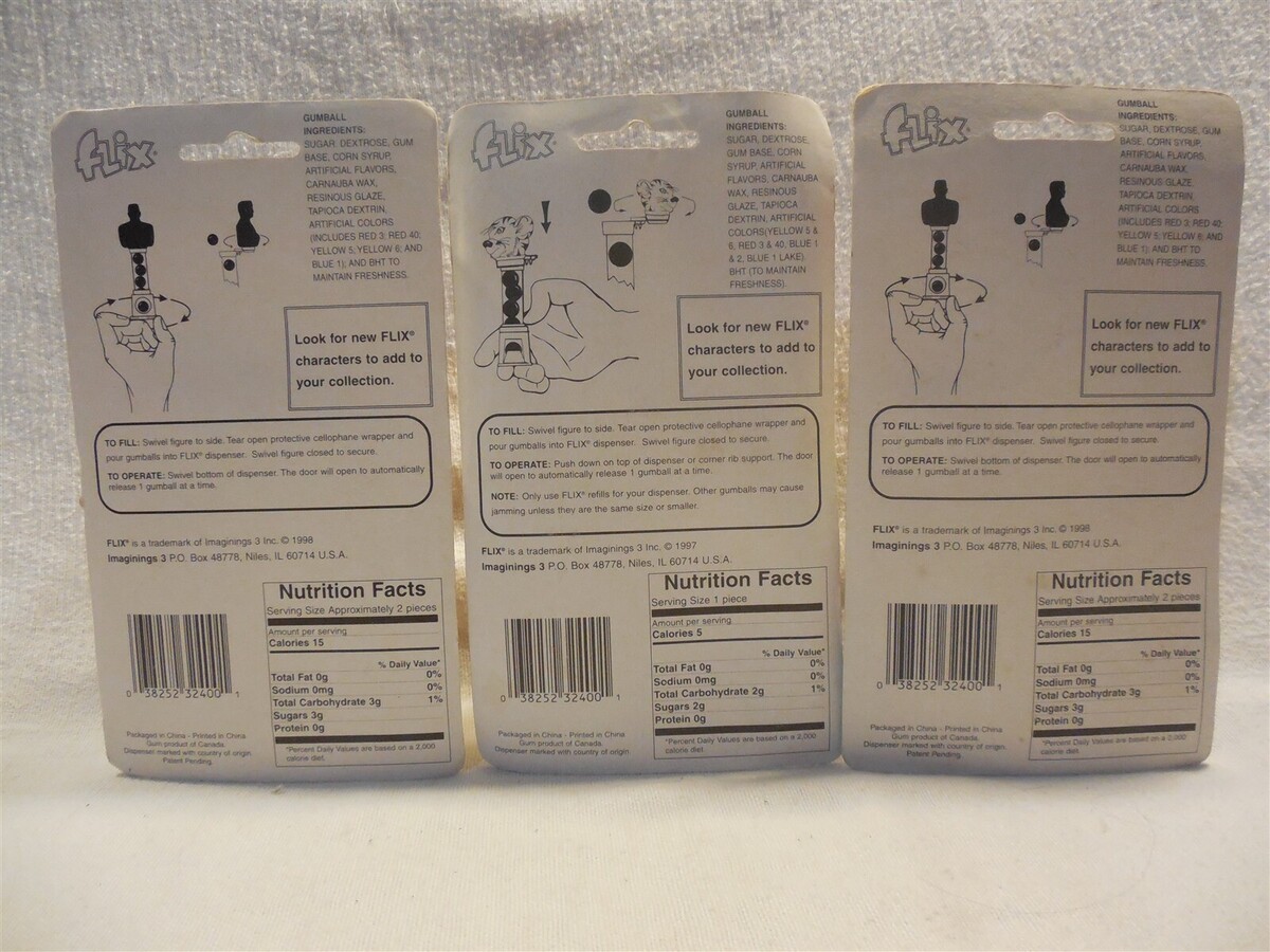This is a set of 3 Flintstones 1997 Flix gumball machine dispensers. The set includes 2 Freds and 1 Pebbles Flintstone. The Pebbles dispenser has a square red bottom. Both Fred bottoms are round with one being red and the other being blue. The dispensers are filled with gumballs and come with 2 additional sleeves of gumballs. All 3 are still sealed on their display cards. Powered by SixBit's eCommerce Solution