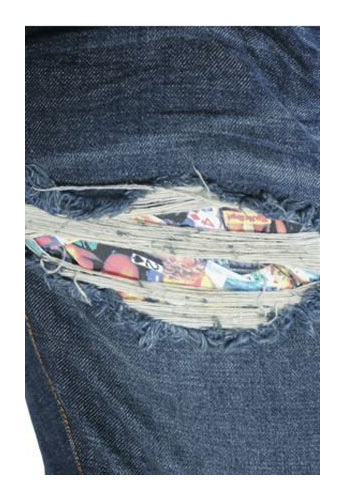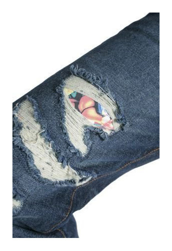 Hanno cucito un tessuto con carte da gioco con donne nude stampate su di esso dietro i buchi in difficolta nei pantaloni, quindi non vedrai le gambe, ma parti del tessuto con le donne.