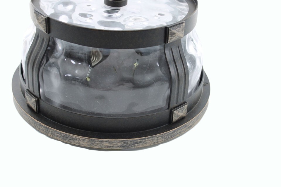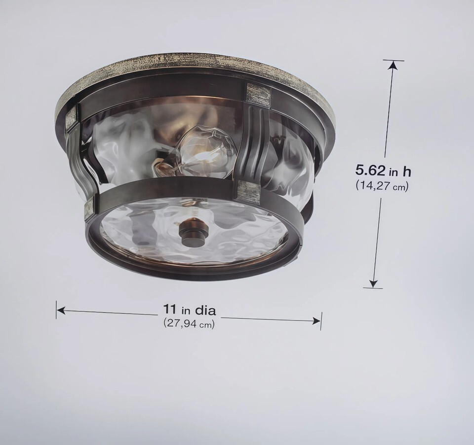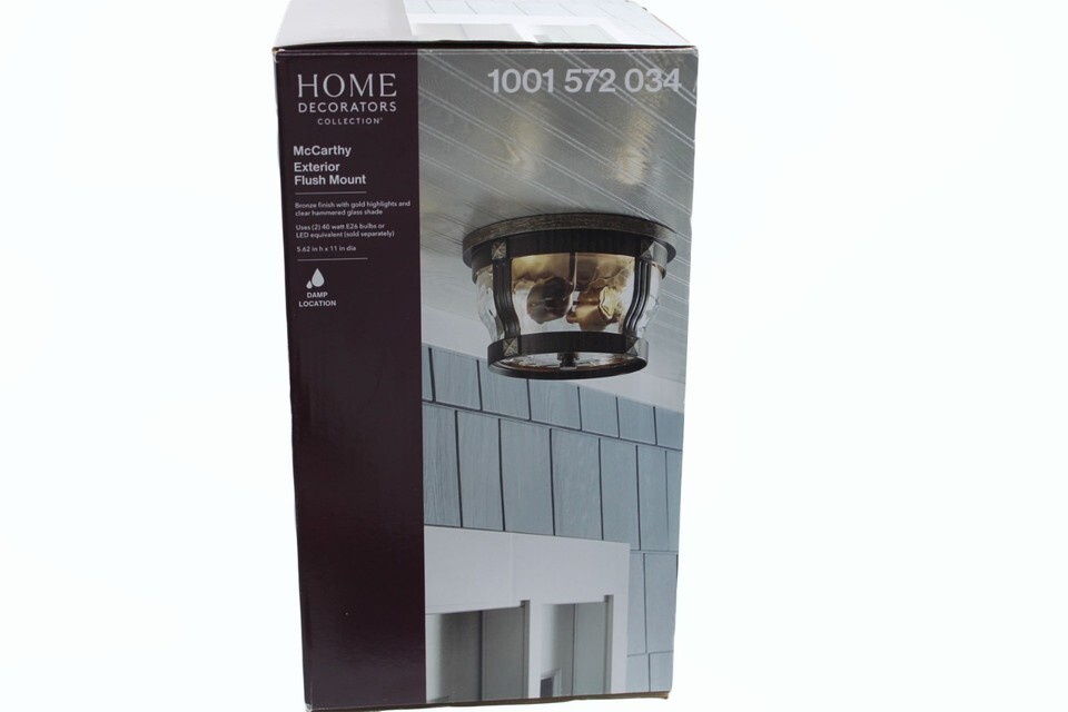 The Flushmount Home Decorators Collection McCarthy 2-Light Bronze Outdoor Flushmount is a stylish and functional lighting fixture designed for outdoor spaces. This flushmount features two lights, a hammered bronze finish, and a brown glass shade, adding a touch of elegance to any outdoor area. With no assembly required and a voltage of 120V, this fixture is easy to install and perfect for use in entryways, porches, kitchens, bathrooms, living rooms, bedrooms, home offices, and dining rooms. Ideal for adults, this light fixture brings a cozy and inviting atmosphere to any space.